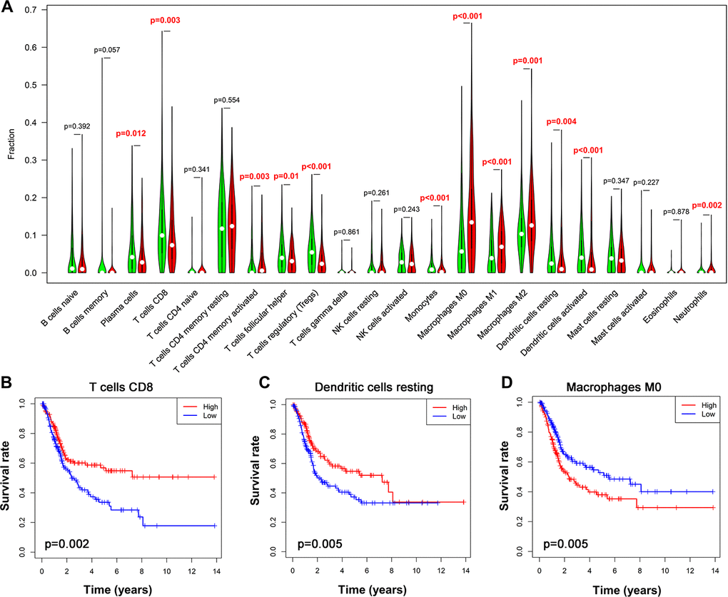 TIICs have been suggested as independent predictors of survival in various cancer and are regulated by immune-related genes [27, 28]. We therefore evaluated the correlation between immune cells fractions in UBC tissues and risk models using CIBERSORT [29]. This analysis revealed that among the 22 immune cells, activated CD4+ memory T cell, macrophages and neutrophils positively correlated with the 10-IRG risk status, while CD8+ T cells, follicular helper T cells, regulatory T cells, and monocytes negatively correlate with the immune-related risk score (Figure 9A). To cross examine the data, further analysis showed that macrophages and neutrophils were positively correlated with the 10-IRG risk status, while CD8+ T cells were negatively correlate with the immune-related risk score with both methods for deconvolution (Figure 9A and Supplementary Figure 3). Moreover, a correlation heatmap demonstrated that different immune cells fractions have a weak/moderate correlation (Supplementary Figure 4). The proportion of CD8+ T cells, dendritic cells resting, and macrophages (Figure 9B–9D) significantly correlate with survival. These data may reveal the poor clinical outcome in the high-risk cohort in part.