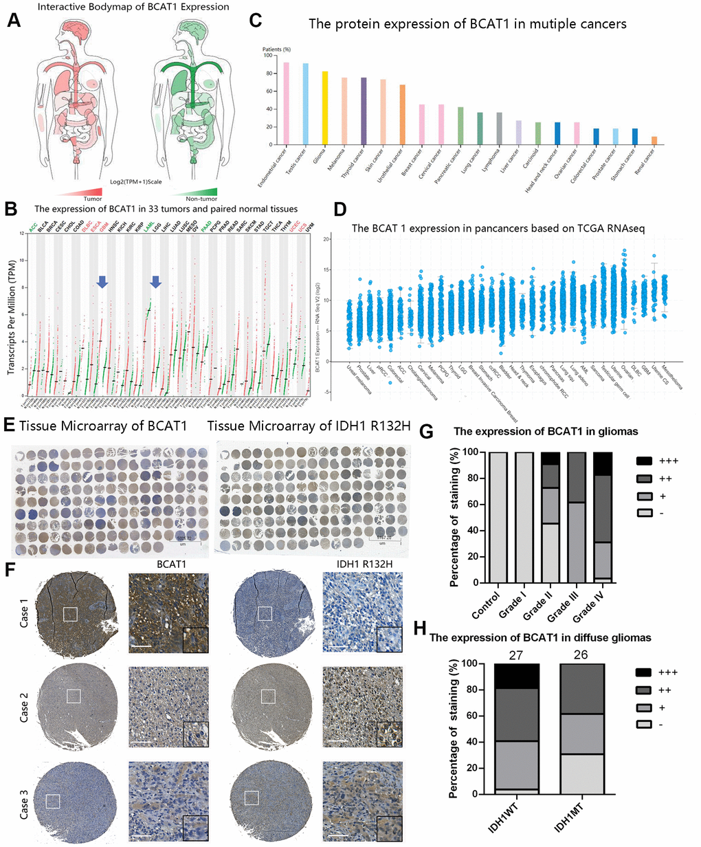 To evaluate the general expression pattern of BCAT1 in gliomas, we compared the mRNA and protein levels of BCAT1 between different tumors, grades, histological and molecular subtypes through several online databases. The mRNA expression of BACT1 in 33 types of tumor tissues (see the extension of tumor abbreviations in Supplementary Table 1) and its paired control tissues were shown in Figure 1A, 1B. Compared to other tumors, glioblastoma (GBM) owns one of the highest levels of BCAT1 expression. Notably, the mRNA level of BCAT1 in GBM is significantly higher than that in LGG. The Human Protein Atlas and TCGA databases also confirmed that gliomas own a high expression of BCAT1 among pan-cancers (Figure 1C, 1D). Collectively, these data indicate that BCAT1 is enriched in glioma tissues and upregulated in GBMs. Furthermore, we took advantage of clinical human glioma samples to detect the protein pattern of BCAT1 and IDH1 R132H in glioma tissues (Figure 1E, 1F). The results showed that BCAT1 is increasingly expressed in glioma tissues corresponding to increasing tumor grade (Figure 1G), and compared to IDH1 wild-type diffuse glioma patients (Figure 1H), the patients that had gained IDH1 R132H mutation showed a lower percentage of tumor cells with detectable BCAT1 expression. In addition, the data from GSE16011, GSE4290, REMBRANDT, TCGA and CGGA datasets reconfirmed our previous findings and detailed that BCAT1 is preferentially expressed in classical and mesenchymal subtype and less expressed in proneural subtype glioblastoma (Supplementary Figure 1).