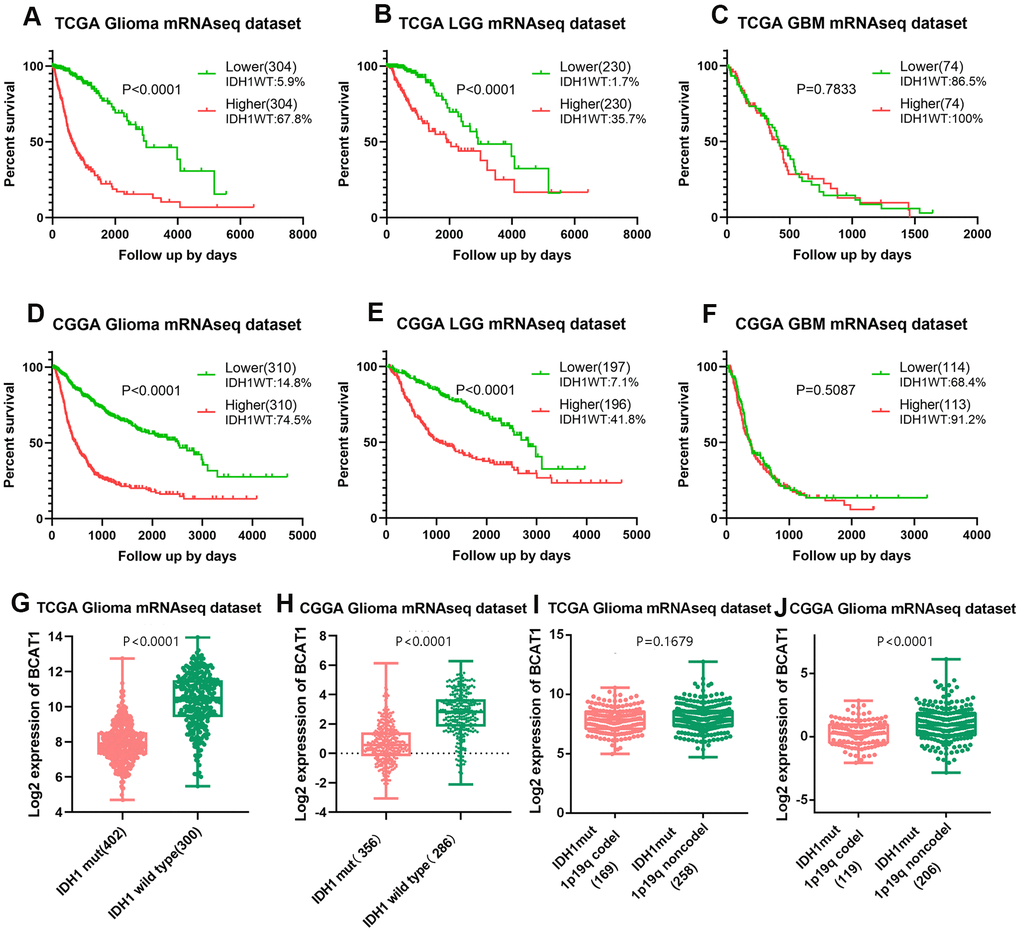 To determine the prognostic value of BCAT1 gene expression and its association with IDH1 status in glioma patients, Kaplan-Meier (K-M) survival curves with known IDH1 wildtype ratio was performed with data from the TCGA and CCGA RNA sequencing datasets. The results showed that the overall survival (OS) time of glioma patients with higher BCAT1 expression (TCGA, IDH1WT:67.8%; CGGA, IDH1WT:74.5%) is shorter than patients with lower BCAT1 expression (TCGA, IDH1WT:5.9%; CGGA, IDH1WT:14.8%) (Figure 2A, 2D). Moreover, in LGG, higher BCAT1 expression (TCGA, IDH1WT:35.7%; CGGA, IDH1WT:41.8%) is also connected with a worse overall survival time than lower BCAT1 expression (TCGA, IDH1WT:1.7%; CGGA, IDH1WT:7.1%) (Figure 2B, 2E), while in GBM, there is no significant difference between BCAT1 higher (TCGA, IDH1WT:100%; CGGA, IDH1WT:91.2%) and lower groups (TCGA, IDH1WT:86.5%; CGGA, IDH1WT:68.4%) (Figure 2C, 2F). Moreover, we found that IDH1 wild-type gliomas showed a higher expression of BCAT1 than mutant types in both TCGA and CGGA datasets (Figure 2G, 2H), and further internal comparison of IDH1 mutant gliomas showed that 1p19q codeleted IDH1 mutant gliomas owns a lower expression than non codeleted 1p19q forms with a significant difference in the CGGA dataset (Figure 2I, 2J). Those results implied that BCAT1 contributes to the poor survival of IDH1 wild-type glioma patients.