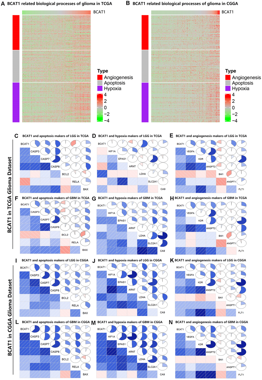 To illuminate the biological features of glioma with different BCAT1 expression, we examined the correlation of BCAT1 expression with angiogenesis, apoptosis and hypoxia marker genes to evaluate the relationship between BCAT1 expression and tumor microenvironment. As shown in functional heatmap analyses, glioma-derived BCAT1 expression was positively correlated with biomarker gene expression of apoptosis, hypoxia and angiogenesis in both the TCGA and CGGA datasets (Figure 3A, 3B). Similarly, Pearson correlation analysis was performed to retest the correlation of interest gene sets with BCAT1 expression in LGG and GBM based on TCGA and CGGA datasets. After screening several apoptosis markers including CASP3, CASP7, CASP8, BCL2, RELA and BAX; hypoxia markers including HIF1A, EPAS1, ARNT, LDHA, SLC2A1 and CA9; angiogenesis markers including VEGFA, KDR, ANGPT2, BAI1, ANGPT1 and FLT1 as shown by correlograms, the results were consistent with the heatmap analysis. BCAT1 expression was positively correlated with apoptosis, hypoxia and angiogenesis markers (Figure 3C–3N). Interestingly, it seems BCAT1 is tighter associated with these genes in GBM than in LGG (Figure 3C–3N). These results suggested that BCAT1 is associated with the apoptosis, hypoxia and angiogenesis processes in gliomas, especially in GBM.