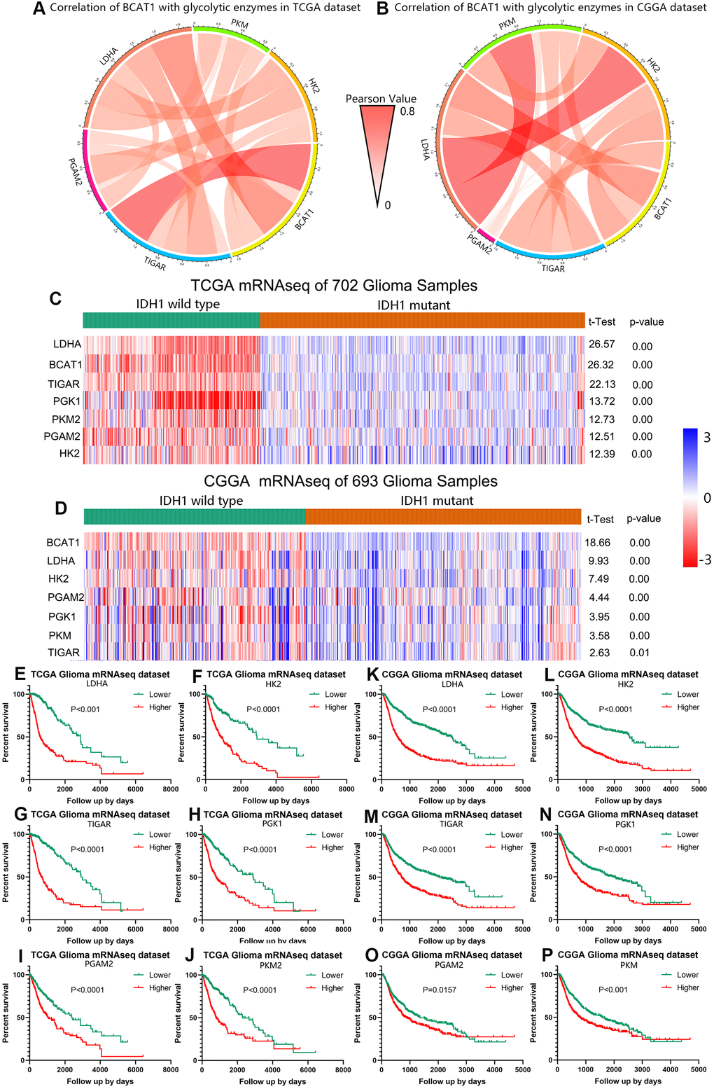 The gene expression of BCAT1 in tumor and non-tumor tissues was obtained and analysis was performed by Gene Expression Profiling Interactive Analysis (GEPIA, http://gepia.cancer-pku.cn/). The mRNA expression of BCAT1 in different glioma grades, subtypes and other conditions was calculated by GraphPad Prism 8. The markers for apoptosis, hypoxia and angiogenesis were selected based on signature profiles from CancerSEA. The heatmaps revealed the mRNA expression of BCAT1 and other genes of apoptosis, hypoxia and angiogenesis in the TCGA and CGGA datasets R programing language using “complexheatmap” package. The correction analysis between BCAT1 and other genes of apoptosis, hypoxia and angiogenesis in the TCGA and CGGA datasets was performed through “corrplot” package. Circos plots revealing the correlation of BCAT1 with glycolytic enzymes and immune checkpoints were conducted by R language using “circlize” package. The Pearson correction analysis between BCAT1 and immune cell (M2, Treg) markers was conducted by R language using “ggpubr” package.