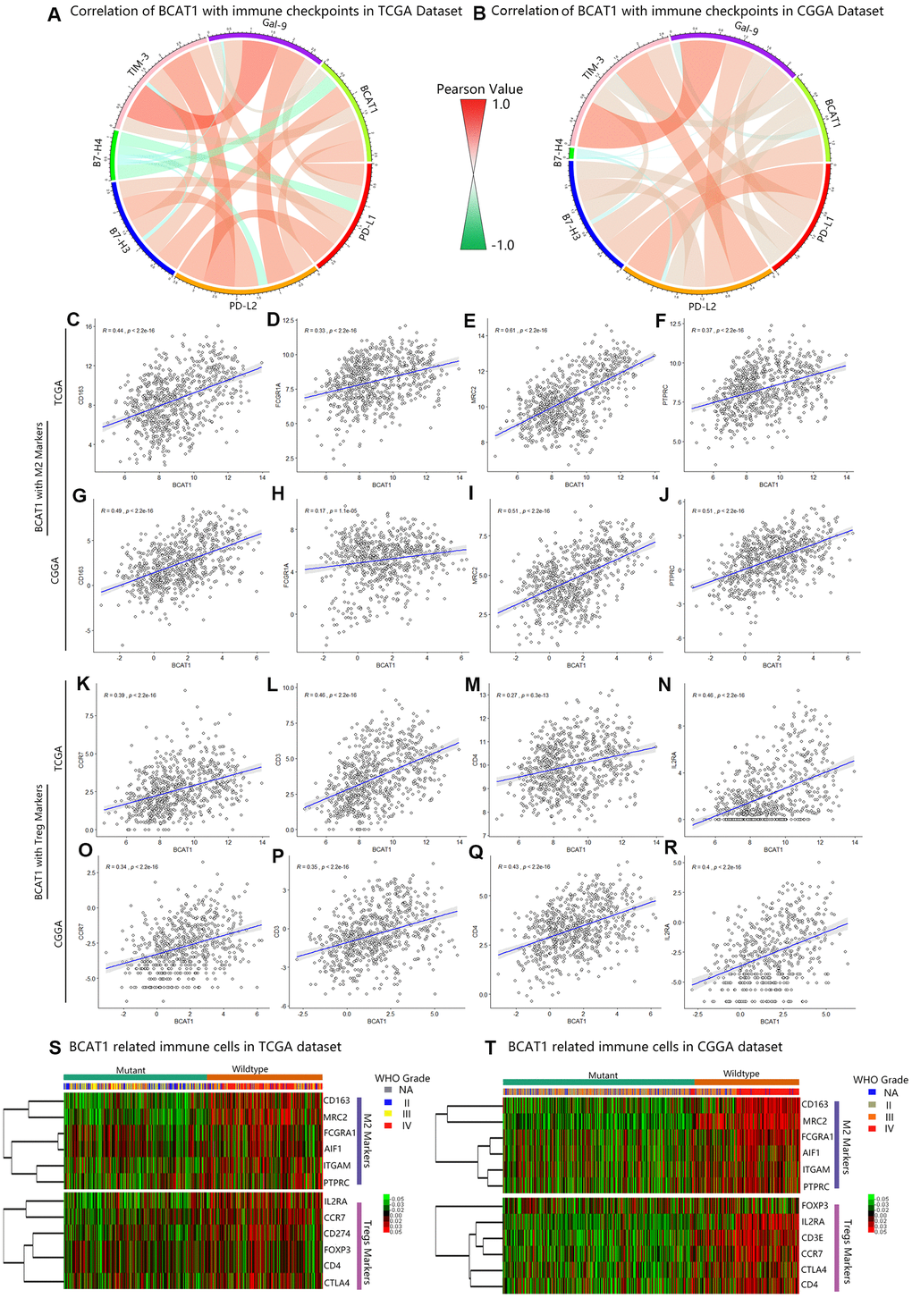 The immunological tumor microenvironment of diffuse gliomas differs in regards to IDH mutation status. IDH1 wild-type gliomas display a more immunosuppressive tumor microenvironment including a more prominent immune cell infiltration and higher PD-L1 expression [22]. To further explore the role of BCAT1 in the immunosuppressive status of gliomas, Circos plots were performed based on the correlation between BCAT1 and six immune checkpoints (PD-L1, PD-L2, B7H3, B7H4, TIM-3, Gal-9). The results showed that BCAT1 synergized well with other immune checkpoint molecules in gliomas, which were observed in both TCGA and CGGA datasets (Figure 5A, 5B). The Pearson correlation analysis further showed that BCAT1 was positively associated with M2 macrophage markers (CD163, FCGR1A, MRC2, PTPRC) and Treg markers (CCR7, CD3, CD4, IL2RA) in both TCGA (Figure 5C–5J) and CGGA (Figure 5K–5R) datasets. Then, mutual relationship analysis of BCAT1 related immune cells was further conducted to identify their clusters according to IDH status and tumor grades. The results demonstrated that M2 macrophages and Tregs were preferentially involved in IDH1 wild-type and higher grades gliomas (Figure 5S, 5T). Overall, these data suggest BCAT1 is correlated with the immunosuppressive signature of IDH1 wild-type gliomas.