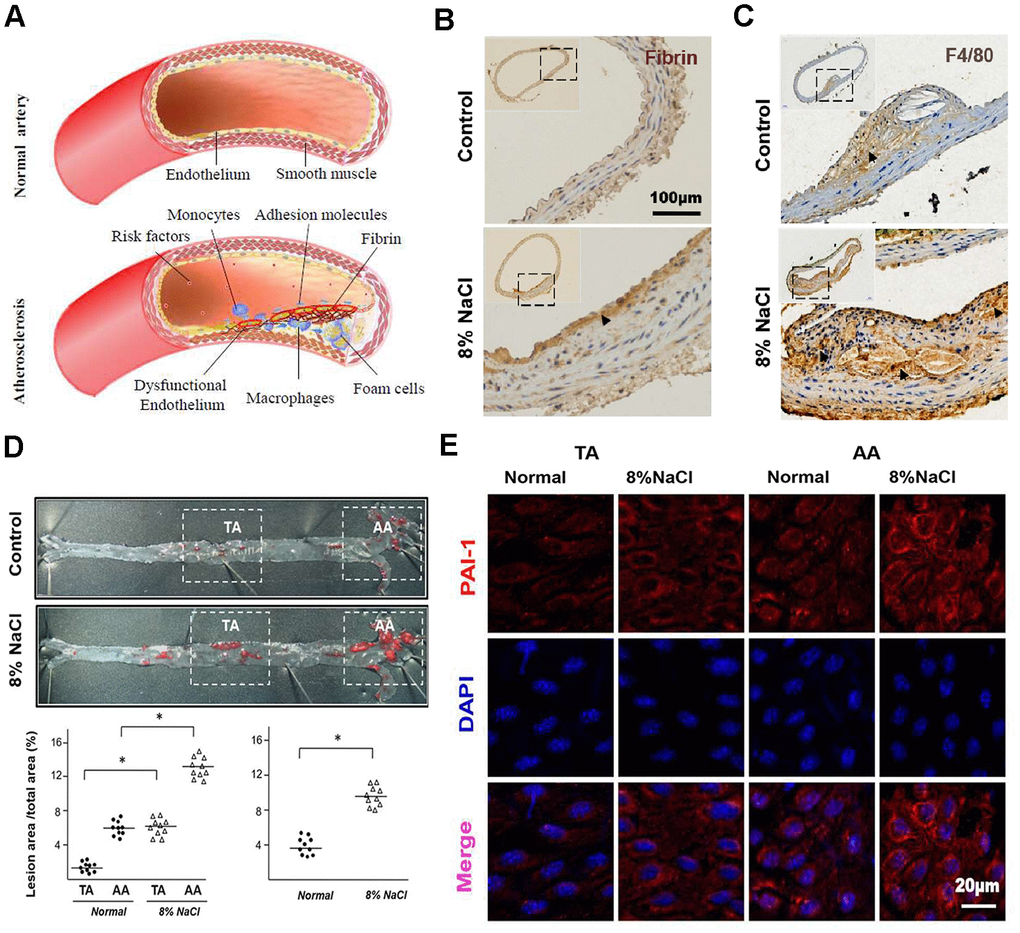 In the present study, we revealed a new mechanism that HS significantly activates PAI-1 via NFAT5 to further promote fibrin deposition and macrophage infiltration in ECs. The impact of HS diet on AS formation, fibrin deposition, and macrophages infiltration in the artery of ApoE−/− mice was first evaluated. Then, the effects of HS on the expression of PAI-1, NFAT5, and downstream target gene in ECs were investigated. The molecular mechanism of NFAT5 activating downstream signal pathways via PAI-1 was further studied. All results indicated that NFAT5 was the key regulator of PAI-1-mediated fibrin deposition and macrophages infiltration.