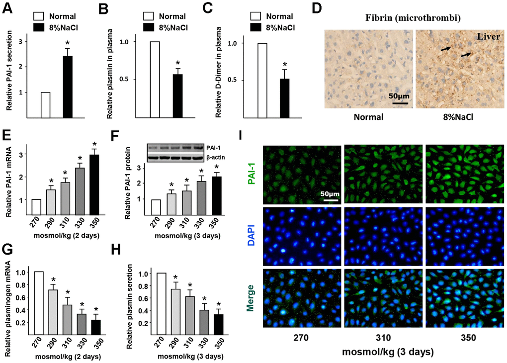 To further verify the promotion of HS on endothelial PAI-1 expression and fibrinolytic dysfunction, some media with different osmolarities (270 - 350 mosmol/kg) were used to culture HUVECs. The results of RT-PCR and western blot (Figure 2E, F) displayed that the gene and protein expression of PAI-1 was significantly up-regulated in a dose-dependent manner. Immunofluorescent staining results (Figure 2I) also proved that HS promoted the PAI-1 expression in HUVECs. Correspondingly, the mRNA expression of plasminogen in HUVECs and the levels of active plasmin in the supernatant were significantly decreased under HS conditions (Figure 2G, 2H). This confirmed that HS induces PAI-1 expression and impairs fibrinolytic function in ECs.