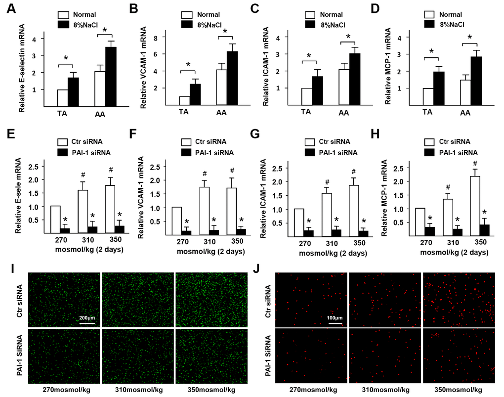Previous studies demonstrated that PAI-1 contributes to neutrophil infiltration. To confirm whether the elevated PAI-1 also contributes to macrophages infiltration in the artery wall of mice with HS diet, the expression of adhesion molecules in endothelial cells was measured. The results of RT-PCR (Figure 3A–3D) revealed that the E-selectin, VCAM-1, ICAM-1, and MCP-1 genes were significantly activated in the HS diet group. It was further confirmed that PAI-1 siRNA could significantly inhibit this HS-induced up-regulation in HUVECs (Figure 3E–3H). In addition, we observed that there was less adhesion and infiltration of monocytes under HS condition when PAI-1 was down-regulated by siRNA according to cell adhesion and transwell migration results (Figure 3I, 3J). In summary, these results indicated that HS-promoted PAI-1 contributes to the dysfunction of inflammatory cell adhesion and infiltration to ECs.