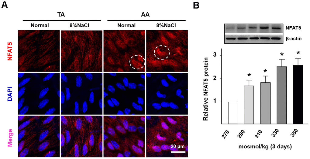 It has been claimed that NFAT5 could be significantly activated under intracellular hyperosmotic pressure [27]. Thus, we further investigated the difference of NFAT5 expression in the artery wall between normal and HS groups. From the RT-PCR results (Supplementary Figure 3A), it was found that the gene expression of NFAT5 in HS group was significantly higher than that of the control group. The results of En face immunofluorescent staining (Figure 4A) also presented that HS diet significantly increased the protein expression of endothelial NFAT5 in the AA region. Moreover, Figure 4A showed that NFAT5 expressed more in the cytoplasm of the control group, but gradually translocated into the endothelial nucleus under HS condition.