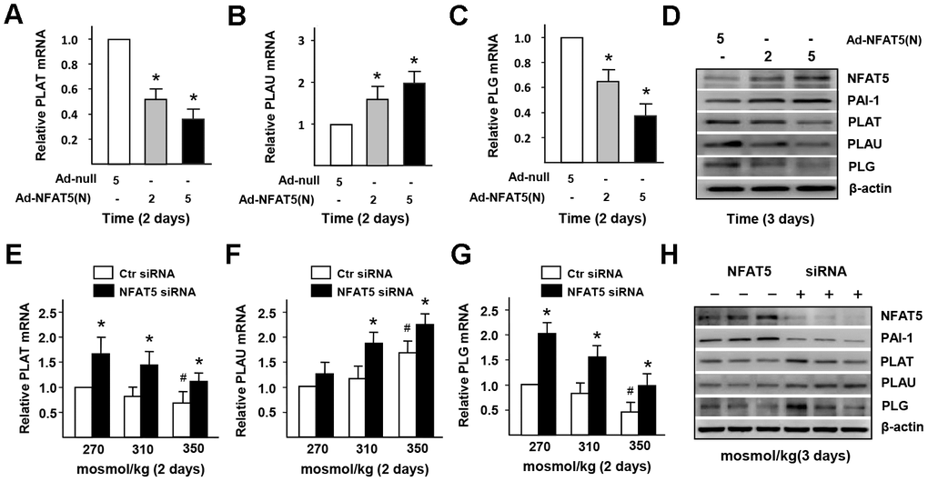 In order to investigate whether NFAT5 regulates HS-inducted the dysfunction of fibrinolysis in ECs, we overexpressed the expression of NFAT5 using Ad-NFAT5 in HUVECs. The results of RT-PCR and western blot (Figure 5A–5D). displayed that the gene and protein expressions of PLG and PLAT were down-regulated after treating with Ad-NFAT5. However, overexpression of NTAT5 increased the mRNA expression of PLAU but decreased its protein expression. Contrarily, we suppressed the NFAT5 expression in HUVECs with siRNA. The results of RT-PCR and western blot (Figure 5E–5H) demonstrated that the gene and protein expressions of PLG, PLAT, and PLAU in NFAT5 siRNA-treated group were significantly higher than that in the control group. ELISA and statistical analysis (Supplementary Figure 4A) further showed that the concentration of HS-inhibited plasmin was elevated in the NFAT5 siRNA-treated group. These results suggested that NFAT5 mediated the expression and convert of plasminogen to active plasmin.