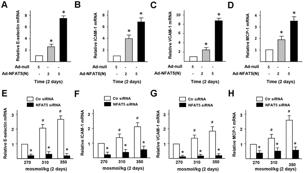 The logarithmically growing HUVECs were cotransfected with recombinant adenovirus encoding NFAT5 (Ad-NFAT5) or adenovirus null (Ad-null) (Cyagen, Guangzhou, China). After two or three days for infection, cells were harvested, and target genes or proteins were measured as described above.
