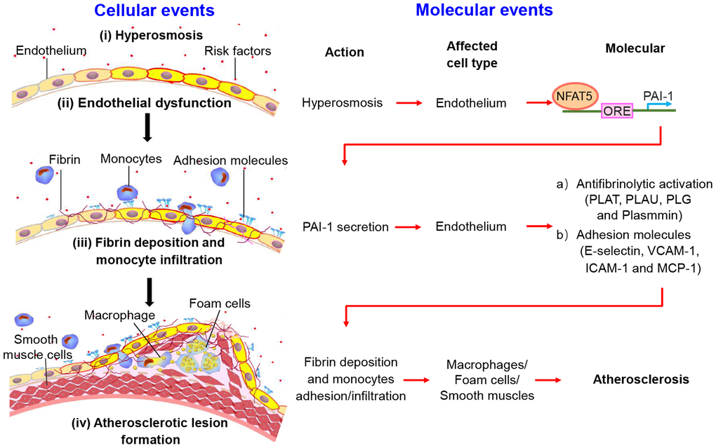 In conclusion, our findings suggested that hypertonic stress, similar to other atherogenic risk factors, such as hypertension, hyperlipidemia, and disturbed flow, promotes PAI-1 expression via NFAT5 in ECs, thus initiating endothelial dysfunction. It promotes fibrin deposition and macrophages infiltration in the artery wall, and leads to the formation of AS. Notably, HS-stimulated NFAT5 activates the transcription activity of PAI-1 by binding to its promoter and activates the dysfunction of endothelial fibrinolysis and monocytes-adhesion/infiltration. The findings identified in this study provide a novel mechanism of atherosclerotic lesions formation, and suggest that ECs are the direct target cells of cardiovascular risk factors that initiate AS. The novel insights into the pathogenesis of AS have clear clinical applications. As the prevalence of severe cardiovascular diseases all over the world, maintaining the tissues below a dysfunctional endowed threshold that contribute to pathological changes would go far towards keeping healthy.