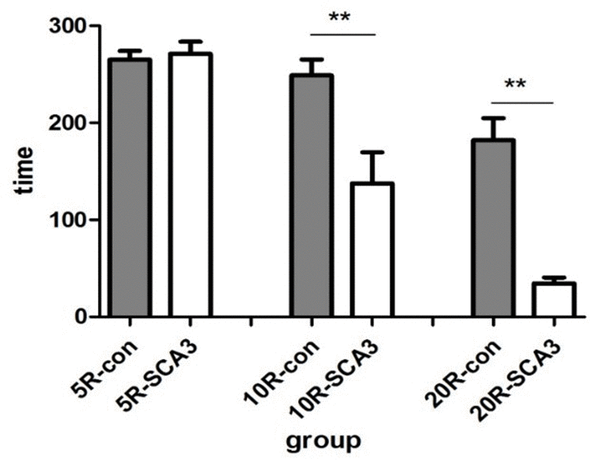 In this study, approximately 50% of the mice in the second generation expressed disease-causing human ataxin-3 with an expanded polyglutamine tract, similar to the report from the Jackson laboratory [23]. The number of CAG repeats in the expanded ATXN3 was 83 or 84 in the second-generation SCA3/MJD mice. To observe their symptoms, the rotation test was conducted. The ataxin3-83/84Q mice exhibited impaired motor coordination and a significantly shorter latency to fall than the WT mice at the same age of 32 weeks (Figure 1). In addition, the ataxin3-83/84Q mice displayed an ataxic, wide-based and irregular gait compared to that of WT mice at 32 weeks (data not shown). Overall, these results indicated that ataxic symptoms similar to those of SCA3 clearly appeared in ataxin3-83/84Q mice at the age of 32 weeks.