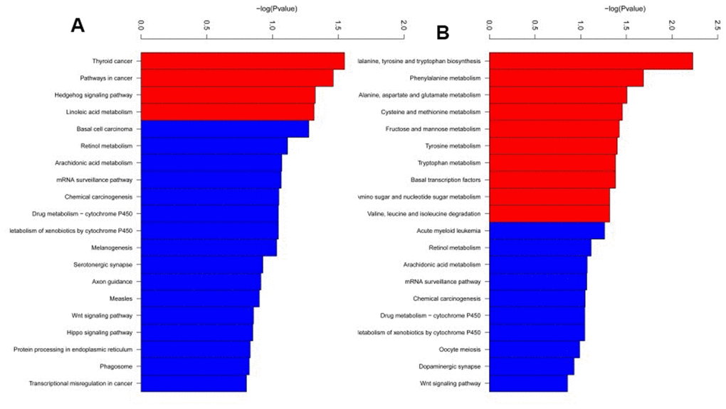 RRBS was carried out using 3 SCA3/MJD and 3 WT mice to identify differentially methylated CpG sites and regions. The average global CpG methylation levels of RRBS samples were 55.86 ±1.1% and 58.07±1.8% in WT and SCA3/MJD group, respectively. No significant difference on global DNA methylation was detected (p>0.05). After quality control and analysis of the data, a total of 135 DMRs were identified between the two groups. As shown in Supplementary Tables 6 and 7, 62 DMRs were hypomethylated and 73 were hypermethylated in SCA3/MJD mice compared to WT mice. Supplementary Tables 8 and 9 showed the DNA methylation levels of CpG sites of DMRs in WT and SCA3/MJD groups. GO and KEGG enrichment analyses were applied to evaluate the differentially methylated genes. In the GO functional analysis, the hypomethylated DMRs in SCA3/MJD mice were enriched in 400 major functional groups. Among these functional groups, 356 were categorized as biological process, only 1 as cellular component, and 40 as molecular function. Among the hypermethylated DMRs in SCA3/MJD mice, 348 major functional groups were enriched. Likewise, 254 groups were assigned to biological process, 23 to cellular component, and 71 to molecular function. As shown in Figure 2, according to the KEGG enrichment analysis, the DMRs were involved in 14 pathways. More specifically, the major DMRs were involved in the pathway tumorigenesis and amino acid biosynthesis.