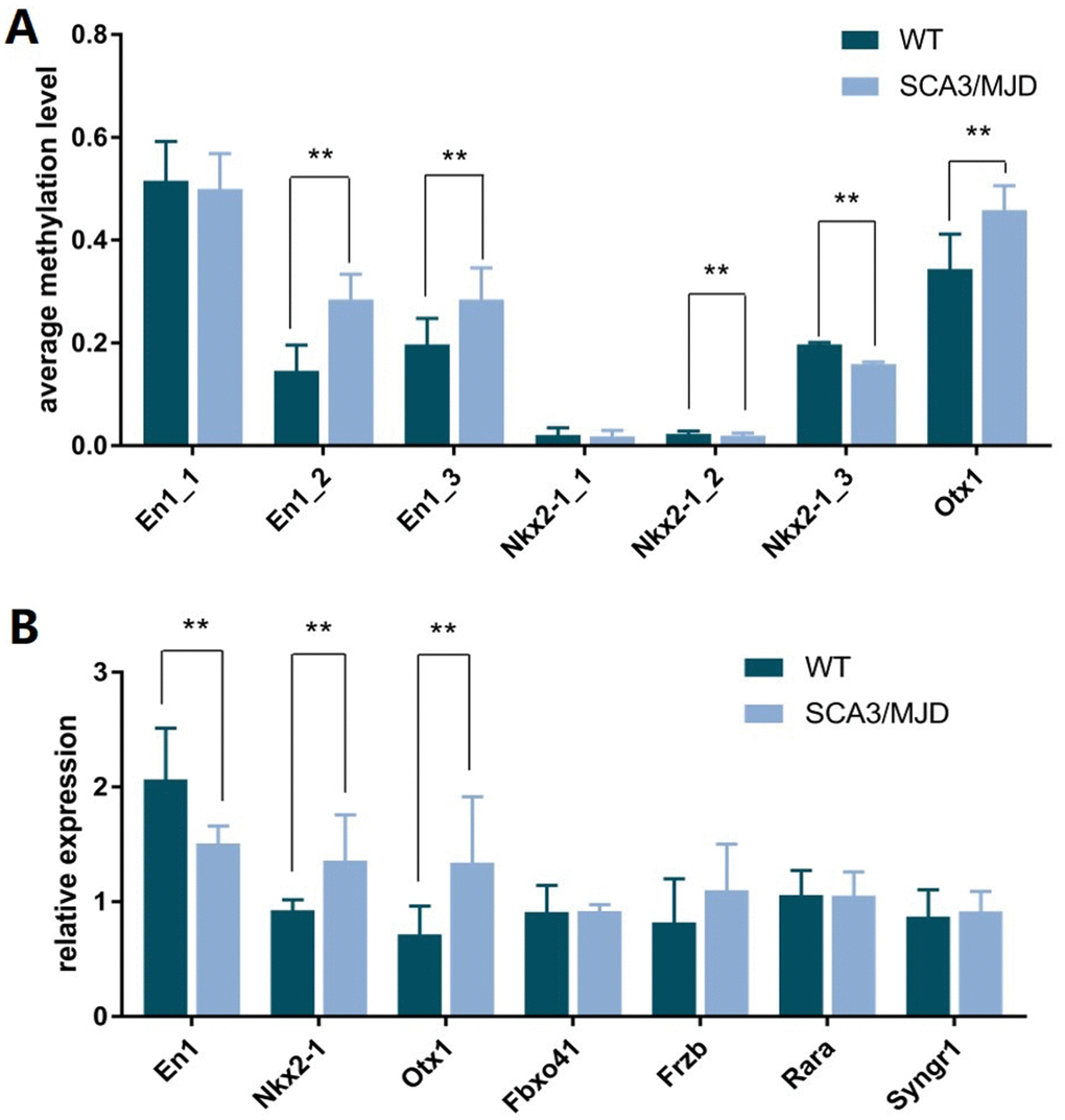 From all the genes with identified DMRs, 7 genes containing 13 DMRs were reported associated with the function of neurons: En1, Fbxo41, Nkx2-1, Syngr1, Rara, Otx1, and Frzb. To determine whether these candidate genes were differentially expressed in WT and SCA3/MJD mouse cerebellum, we analyzed their mRNA expression with qRT-PCR. And their DNA methylation levels were confirmed using MethylTarget sequencing. The primers used for MethylTarget verification and the qRT-PCR are shown in Supplementary Tables 3, 4.