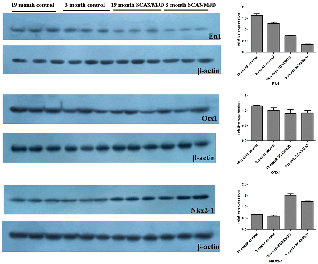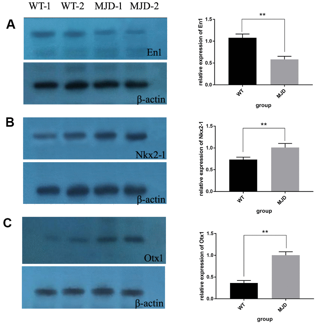In total, 12 cerebellum samples from 6 SCA3/MJD and 6 WT mice of 32-week old were used for the validation experiments. As shown in Table 1 and Figure 3A, compared to the WT group, the En1 (En1_2 and En1_3) and Otx1 (Otx1) sequences were significantly hypermethylated in the SCA3/MJD group. By contrast, significant hypomethylation was detected for Nkx2-1 (Nkx2-1_2 and Nkx2-1_3) in the SCA3/MJD group. As shown in Table 2 and Figure 3B, significant differences in mRNA levels were detected in En1, Nkx2-1 and Otx1, which exhibited distinct DNA methylation patterns in the two groups. Compared to those in the WT group, the mRNA levels of Nkx2-1 and Otx1 were upregulated in SCA3/MJD group, while En1 was downregulated. Therefore, we chose En1, Otx1 and Nkx2-1 for the next analysis. To further consolidate the qRT-PCR results, we compared the translational level of En1, Otx1 and Nkx2-1 between SCA3/MJD and WT mice by western blot. As shown in Figure 4, consistent with the results of mRNA levels, the protein level of En1 was downregulated while the protein levels of Otx1 and Nkx2-1 were upregulated in SCA3/MJD mice (p<0.05).