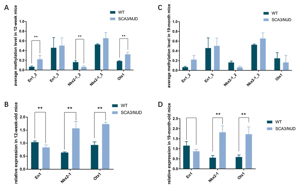 Table 3. DNA methylation rate of sequences in En1, Otx1, and Nkx2-1 in 12 weeks and 19 months mice between SCA3/MJD transgenic and WT groups.