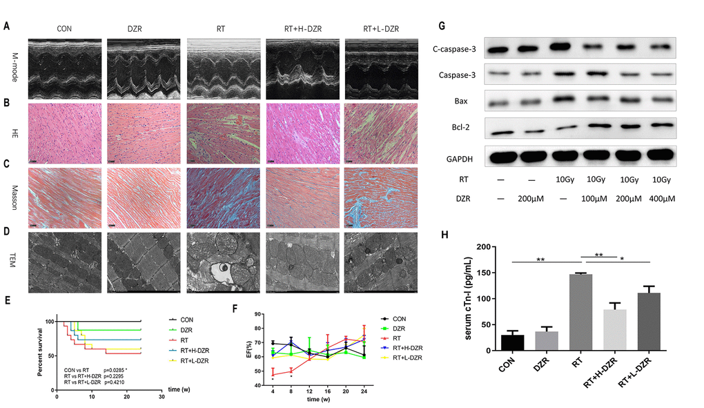Next, we used a rat model to evaluate the cardioprotective role of DZR in radiation-induced heart injury in vivo. Echocardiography was performed every 4 weeks to assess changes in cardiac function associated with RIHD. Type M-mode sonograms used to measure left ventricular ejection fraction (EF) are shown for each group in Figure 1A. EF decreased significantly in RT rats compared to CON rats at 4 (p=0.012) and 8 weeks (p=0.034). This reduction was significantly reversed in the RT+ H-DZR treatment group at 8 weeks (p=0.007), but no significant differences were observed between the groups during the subsequent observation period, suggesting the presence of an acute injury with a later recovery (Figure 1F). Histological evaluation also showed that DZR protected against RIHD as indicated by decreases in chronic fibrosis. HE staining (Figure 1B) and Masson’s trichrome staining (Figure 1C) revealed that cardiomyocytes in RT rats exhibited breakdown, edema, disordered arrangement, twisted myocardial fibers, nuclear condensation, interstitial fiber deposits, and increased numbers of inflammatory cells. Furthermore, transmission electron microscopy (TEM) showed evidence of profound cardiomyopathy-associated subcellular changes. Mitochondria of RT rats exhibited hyperplasia and hypertrophy, appearing swollen with widened or broken cristae. In addition, abnormal sarcomeres, expanded sarcoplasmic reticulum, myofilament fractures, partial focal dissolution, widening of the myo-interstitial space, and deposition of collagen fibers were observed in RT rats. These abnormalities were partially alleviated by DZR treatment, especially in the high dose group (Figure 1D). At week 24, 7 rats in the RT group had died (most within 8 weeks after irradiation), while 4 and 6 rats had died in the RT+ H-DZR and RT+ L-DZR groups, respectively. Although DZR treatment appeared to prolong survival in rats, this effect did not reach statistical significance (Figure 1E). Serum cardiac troponin I (cTnI) levels were significantly increased in the RT group compared to the other groups, suggesting that myocardial injury occurred in rats exposed to radiation. However, this increase was reduced in the RT+ L-DZR (p=0.02) and RT+H-DZR (p<0.01) groups (Figure 1H). These results indicate that the rat model of RIHD was successfully established and that DZR may protect against the development of RIHD.