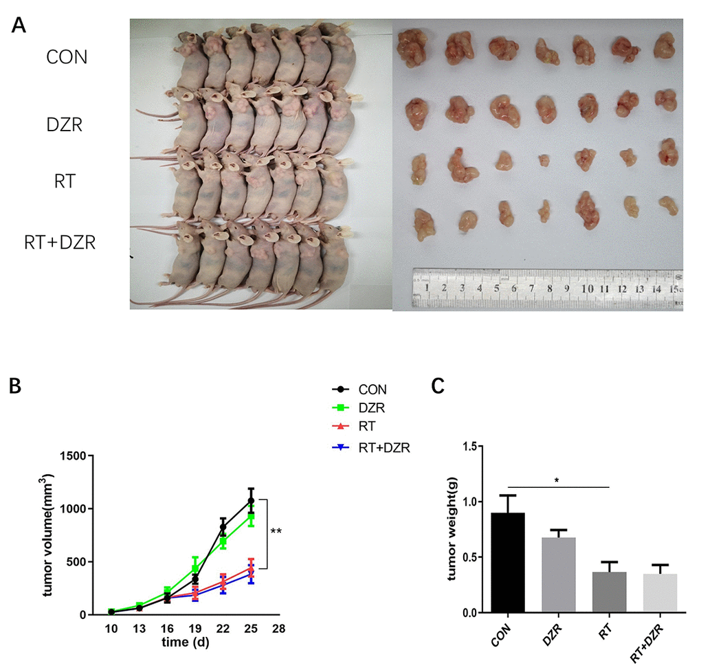H292 cells were obtained from Cell Bank, Chinese Academy of Sciences, China and maintained in RPMI/1640 supplemented with 10% fetal bovine serum (Gibco, USA), penicillin (100 U/mL), and streptomycin (100 Ag/mL) with 5% CO2 at 37° C. Cells were irradiated with a single dose of 8 or 10 Gy using a clinical linear accelerator (6Mv X-rays, Elekta Precise, Stockholm, Sweden). In in vitro experiments, DZR was added to the cell culture medium at a concentration of 100, 200, or 400 μM before irradiation per the protocol described in a previous study [41].