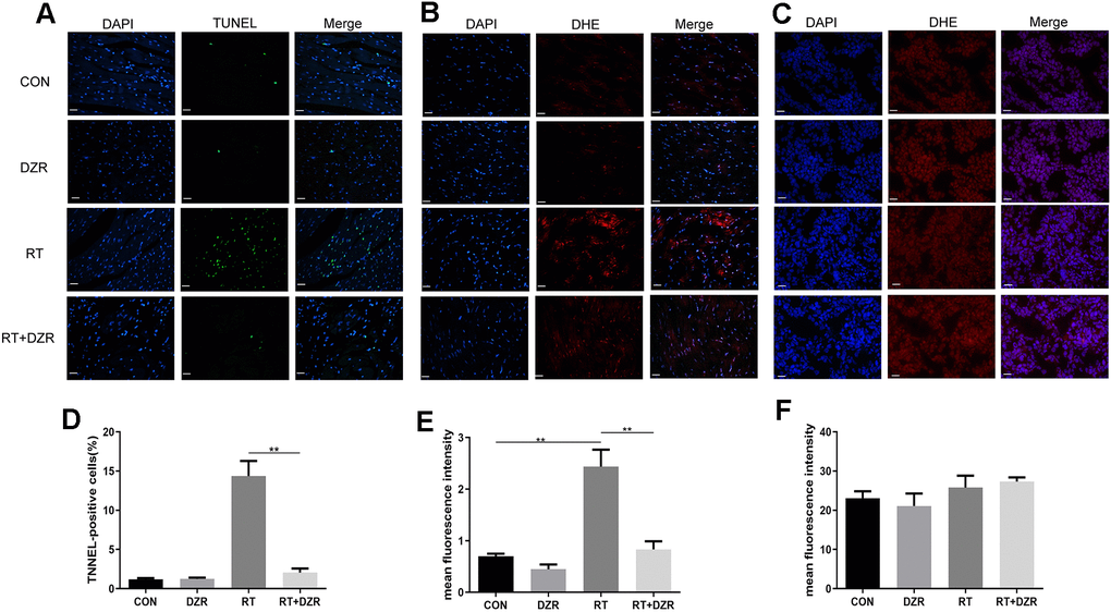 Numbers of apoptotic cardiomyocytes were significantly higher in RT group rats than in CON and RT+H-DZR group rats (referred to as RT+ DZR) for 6 months after irradiation (Figure 3A). The apoptosis rate was 14.37 ± 1.92% in the RT group and 2.04 ± 0.54% in RT+ DZR group (p<0.01) (Figure 3D). This suggests that DZR reduced radiation-induced apoptosis in cardiomyocytes in vivo. In order to investigate the antioxidant activities of DZR, we used a DCFH-DA fluorescence assay to measure ROS in frozen cardiomyocytes from rats and in tumors from nude mice. We found that irradiation increased ROS generation in the rat heart compared to the CON group (p<0.01) (Figure 3B, 3E). Furthermore, combined treatment with DZR significantly reversed radiation-induced ROS generation (p<0.01). However, no obvious fluorescence intensity differences indicative of ROS production were observed in tumors from nude mice among the experimental groups (Figure 3C, 3F). This suggests that DZR reduced apoptosis in normal heart tissues without altering the therapeutic effects of radiotherapy. This might be a result of selective suppression of radiation-induced ROS generation in rat cardiomyocytes and not in tumor tissue from nude mice.