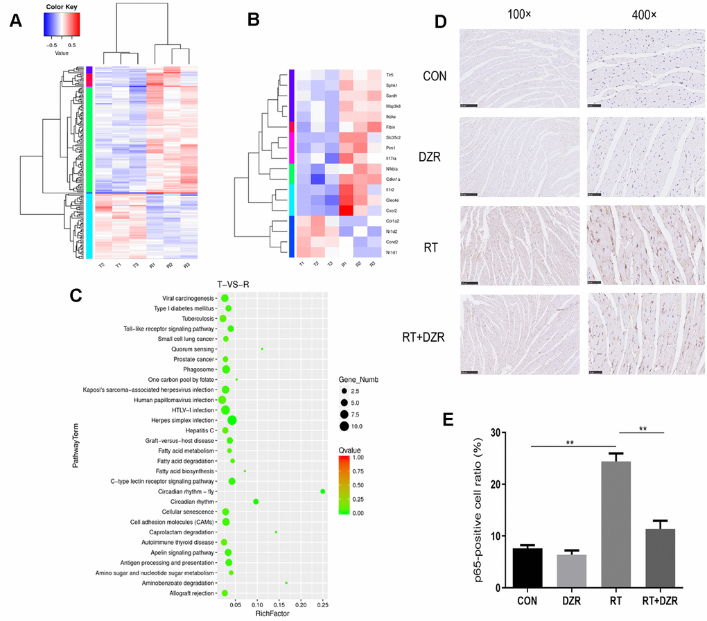 In order to elucidate the mechanisms underlying the protective effects of DZR against RIHD, gene expression in cardiac tissue from RT+ DZR and RT group rats was analyzed using transcriptome sequencing (Figure 4A). The heat map revealed that transcription of four genes involved in the Toll-like receptor signaling pathway, IKBKE, MAP3K8, NFKBIA, and TLR5, was significantly inhibited in the RT+ DZR group compared to the RIHD group (Figure 4B). KEGG pathway analysis of gene set enrichment indicated that gene clusters associated with the Toll-like signaling pathway were downregulated after DZR treatment (Figure 4C). Immunohistochemical analysis revealed that NF-κB subunit p65 protein expression was significantly higher in cardiomyocytes from the RT group (24.42%) compared to the control group (7.61%) (p<0.01). Furthermore, p65 expression was significantly decreased in RT+ DZR rats (p<0.01, Figure 4D, 4E). These findings suggest that the Toll-like/NF-κB pathway was important for the anti-RIHD effects of DZR; this pathway might therefore also play an important role as a downstream effector after activation by ROS.