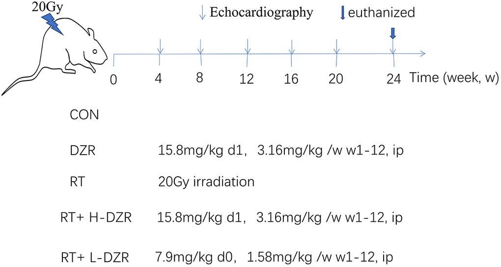 Sixty-five male Sprague-Dawley rats aged 8–10 weeks were obtained from the Experimental Animal Center of Hubei Province and housed in our pathogen-free animal facility with free access to food and water. After one week of acclimatization, they were randomly divided into five groups: control (CON, n=10), dexrazoxane (DZR, n=10), radiation (RT, n=15), radiation with high-dose DZR (a single i.p. dose of 15.6 mg/100 g immediately after irradiation followed by 3.12 mg/100 g i.p. per week until 12 weeks after irradiation, RT+H-DZR, n=15), and radiation with low-dose DZR (a single i.p. dose of 7.8 mg/100 g immediately after irradiation followed by 1.56 mg/100 g per week i.p. until 12 weeks after irradiation, RT+ L-DZR, n=15) (Figure 5).