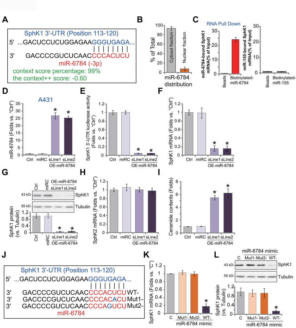 To our knowledge miR-6784 is a relatively novel miRNA with its functions largely unknown. Here, we found that miR-6784 is a novel SphK-targeting miRNA in skin SCC cells. miR-6784 is located at the cytoplasm of skin SCC cells and it binds directly to SphK1 mRNA. In established and primary skin SCC cells, SphK1’s 3-UTR activity, as well as its mRNA and protein expression, decreased following the overexpression of miR-6784. Conversely, antagomiR-6784-mediated miR-6784 silencing elevated SphK1 mRNA and protein. Importantly, the mutant miR-6784 mimics, with mutations at the SphK1’s 3-UTR-binding sites, failed to inhibit SphK1 expression. Therefore, miR-6784 directly binds to and silences SphK1 in skin SCC cells.