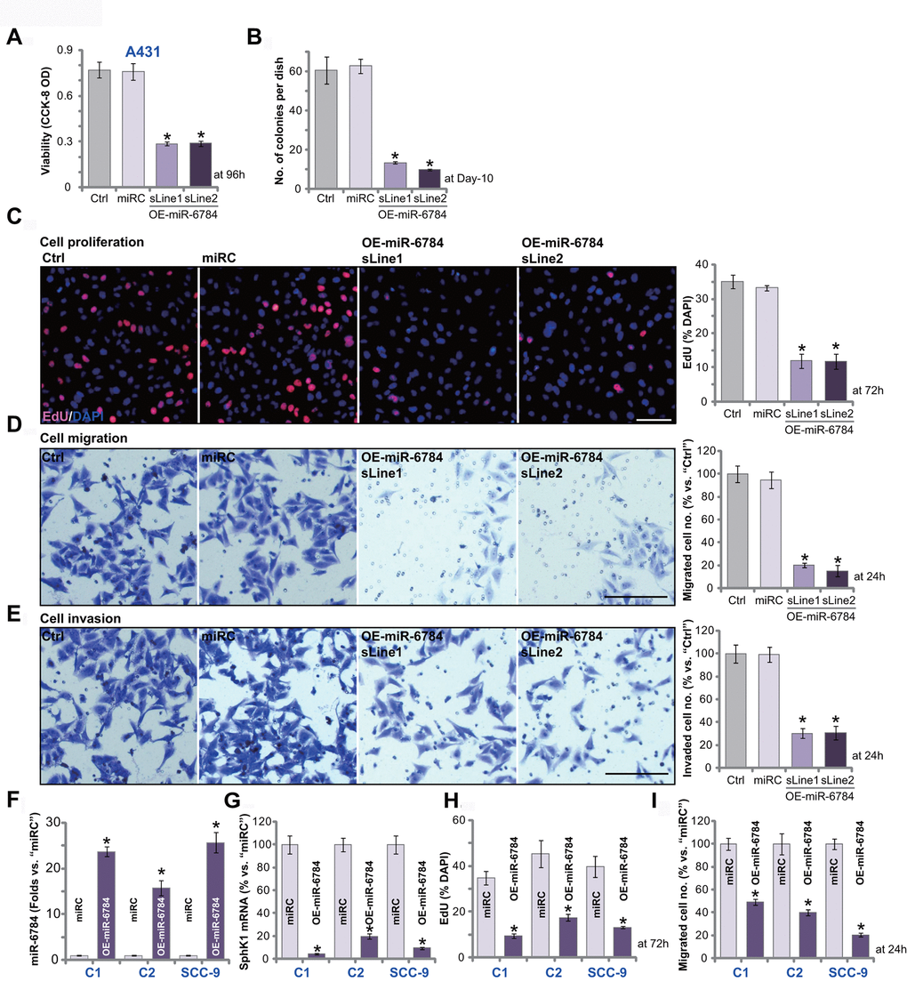 Whether miR-6784 exerted similar effects in other skin SCC cells was tested. The primary human skin SCC cells derived from two skin SCC patients (namely “C1/C2”, from Dr. Liu [14, 27]), as well as SCC-9 established cells, were utilized. These cells were transfected with the lentivirus encoding pre-miR-6784 (lv-miR-6784). Stable OE-miR-6784 cells were established with puromycin selection. When compared to the control cells (with miRC), levels of mature miR-6784 were upregulated in OE-miR-6784 cells (Figure 2F), where SphK1 mRNA expression was silenced (Figure 2G). In “C1” and “C2” primary cells and SCC-9 cells, miR-6784 overexpression inhibited cell proliferation (decreased EdU-positive nuclei ratio, Figure 2H) and migration (“Transwell” assays, Figure 2I). Therefore, in skin SCC cells, miR-6784 overexpression inhibited cell survival, proliferation, migration, and invasion.