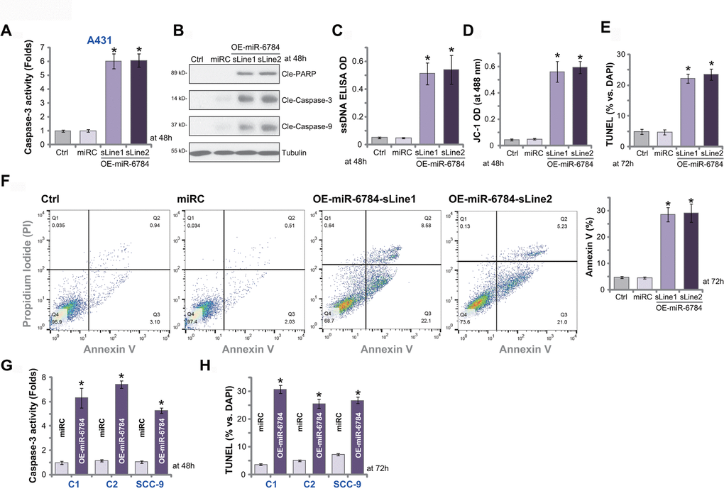 In OE-miR-6784 A431 cells, the TUNEL-positive nuclei ratio was significantly increased (Figure 3E) indicating cell apoptosis induction. It was further confirmed by FACS assays, which showed the increased number of Annexin V-gated A431 cells (Figure 3F). The nonsense control microRNA, miRC, failed to induce significant caspase and apoptosis activation in A431 cells (Figure 3A–3F). In “C1” and “C2” primary cells and SCC-9 cells, ectopic miR-6784 overexpression (“OE-miR-6784”, see Figure 2) significantly increased caspase-3 activity (Figure 3G) and TUNEL-positive nuclei ratio (Figure 3H), suggesting apoptosis activation. These results suggested that miR-6784 overexpression provoked apoptosis activation in skin SCC cells.