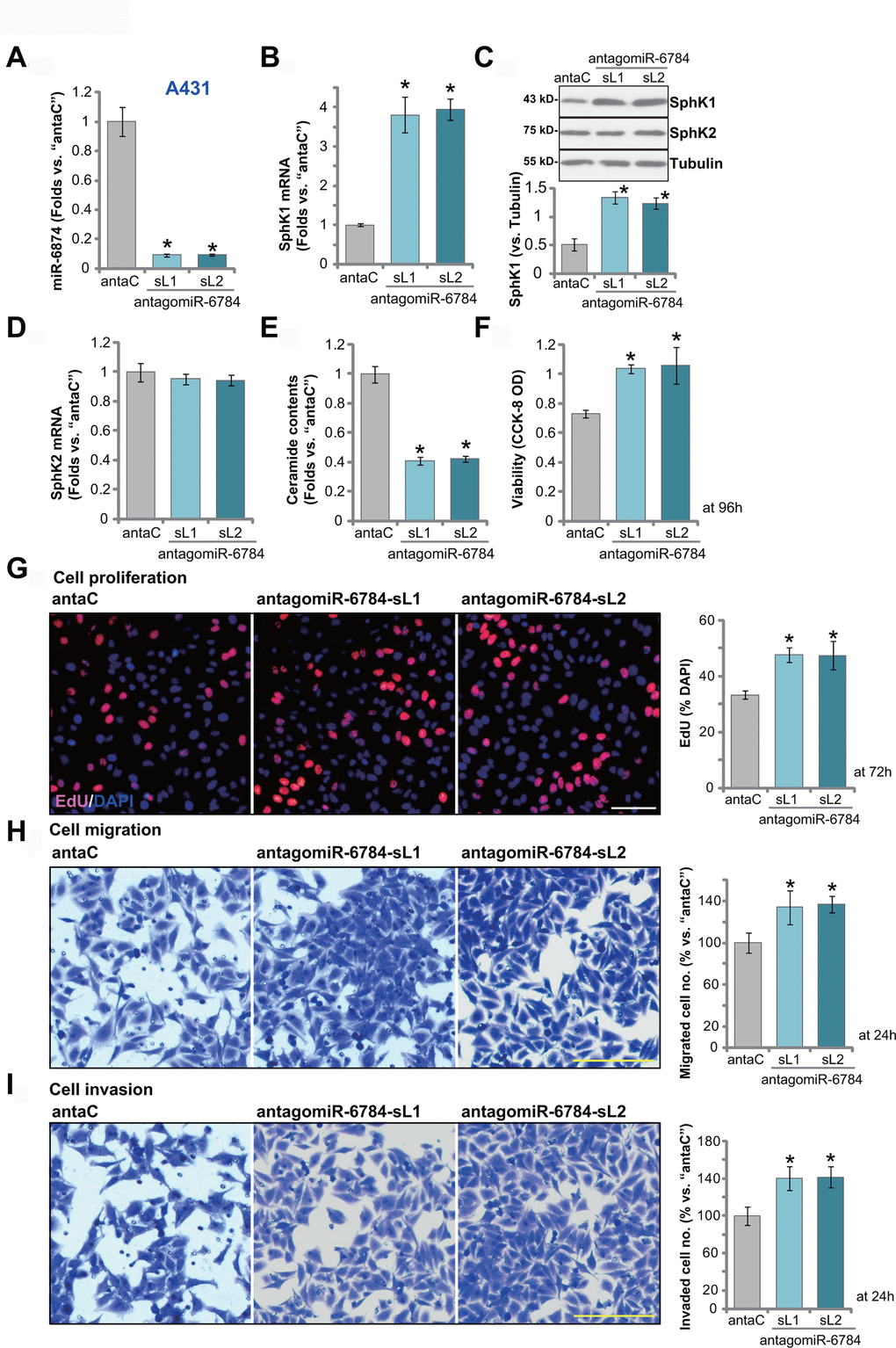 CCK-8 assay results demonstrated that miR-6784 inhibition by antagomiR-6784 increased the viability of A431 cells (Figure 4F). EdU-positive nuclei ratio was increased as well in the antagomiR-6784-expressing cells (vs. antaC control cells, Figure 4G). Furthermore, tested by “Transwell” and “Matrigel Transwell” assays, antagomiR-6784 augmented A431 cell migration (Figure 4H) and invasion (Figure 4I). These results demonstrated that miR-6784 inhibition induced SphK1 elevation and promoted skin SCC cell progression.