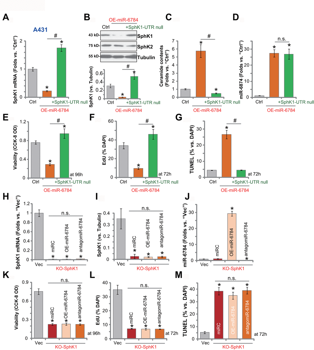In A431 cells, transfection of UTR-null SphK1 construct (“SphK1-UTR null”) alone resulted in significantly elevated expression of SphK1 mRNA and protein (Supplementary Figure 1A). As a result, ceramide contents were decreased (Supplementary Figure 1B) with unchanged miR-6784 expression (Supplementary Figure 1C). Mimicking antagomiR-6784-induce actions by adding SphK1-UTR null construct increased A431 cell viability (Supplementary Figure 1D) and promoted cell proliferation (Supplementary Figure 1E). Cell apoptosis, as expected, was not induced by this construct (Supplementary Figure 1F).