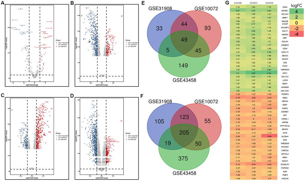 For the GSE74190 dataset, a total of 55 miRNAs (28 upregulated and 27 downregulated miRNAs) were extracted (Figure 1A and Supplementary Table 1), and a total of 711, 597, and 896 genes were extracted from the GSE31908, GSE10072, and GSE43458 datasets, respectively (Figure 1B–1D). These miRNAs and genes had the differently expression between LUAD samples and normal samples. Among the DEGs, 254 overlapped; 49 of these were upregulated (Figure 1E), and 205 were downregulated (Figure 1F). Based on the log fold change (logFC) value, we show the top 25 upregulated and downregulated DEGs as a heat map in Figure 1G.