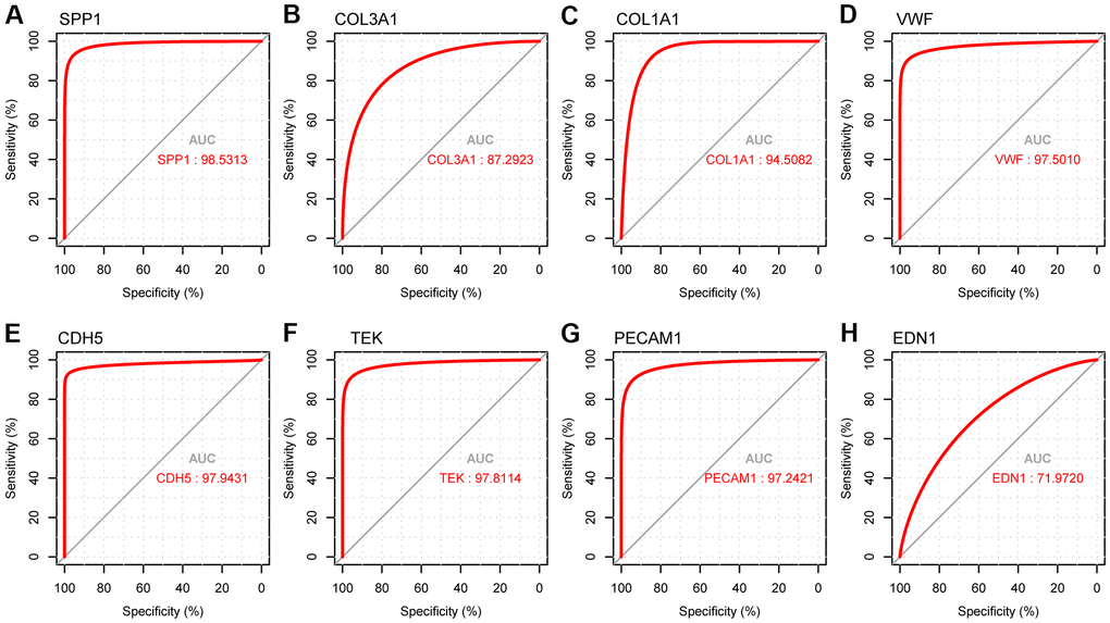 We used the receiver operating characteristic (ROC) curve to predict accuracy of hub genes (Figure 10). The upregulated gene SPP1 and downregulated genes VWF, CDH5, TEK, and PECAM1 had AUC values > 0.97. The ROC curves of the genes had excellent predictive performance and were able to discriminate LUAD from healthy tissues.