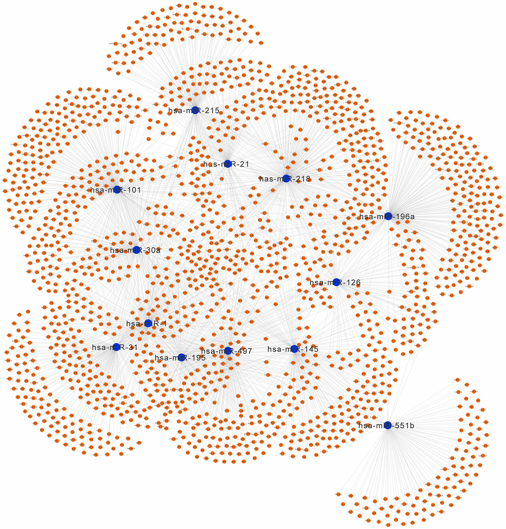 The network of DEMs and predicted targets is presented in Figure 11. The interactive relationship between hub genes and miRNAs is presented in Supplementary Figure 1 and Supplementary Table 2. Notably, hsa-miR-31 targeted COL1A1, VWF, and TEK; hsa-miR-196a targeted COL1A1 and COL3A1; hsa-miR-215 targeted TEK; hsa-miR-218 targeted COL1A1; hsa-miR-1 targeted EDN1; hsa-miR-145 targeted PECAM1; hsa-miR-195 targeted VWF, COL1A1, and COL3A1; hsa-miR-101 targeted CDH5; and hsa-miR-497 targeted VWF and COL1A1.