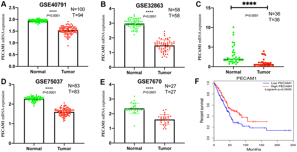 In four analyses, the mRNA levels of PECAM1 in tumor samples were lower than those in normal samples (P < 0.05; Figure 12A–12D). In addition, the qRT-PCR was conducted to demonstrate the transcript level of PECAM1 which was lower in our LUAD tumor samples (P <0.0001) in Figure 12E.