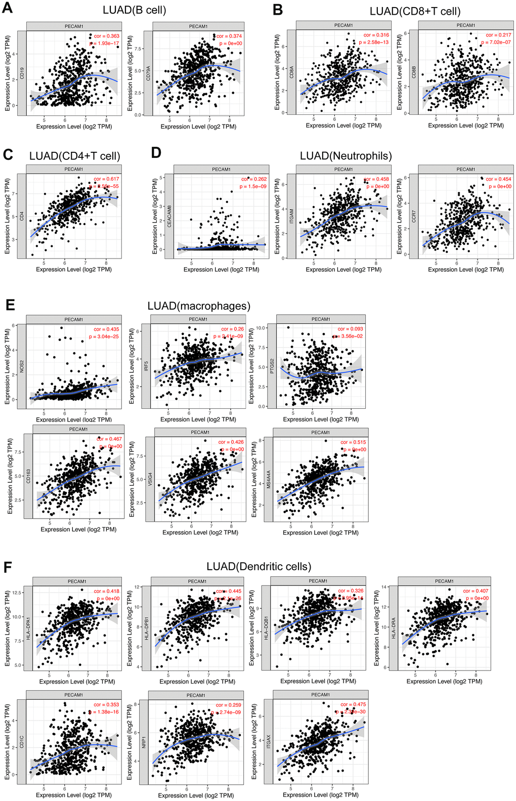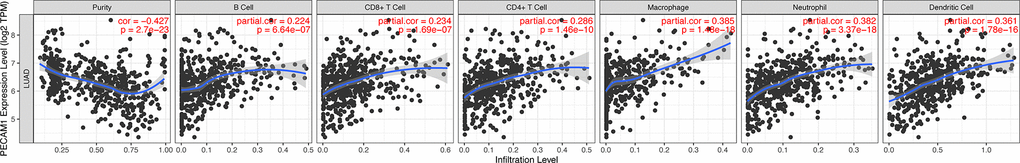 The online tool TIMER is a resource for comprehensive analysis of immune infiltration across multiple cancer types. We used TIMER on LUAD sample data to assess these infiltrates. Then, the relationship between expression of PECAM1 and immune infiltration was demonstrated. Furthermore, the database was used to explore the association between PECAM1 expression and gene markers of immune cells in LUAD.