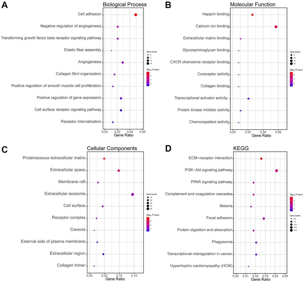 The biological processes (BP) results showed that overlapping DEGs were dramatically concentrated in cell adhesion, negative regulation of angiogenesis, and others in Figure 2A. Regarding molecular function (MF), the overlapping differentially expressed genes were significantly concentrated in heparin binding, extracellular matrix (ECM) binding, and others in Figure 2B. Regarding cellular components (CC), the overlapping DEGs were concentrated in proteinaceous ECM, membrane raft, and others in Figure 2C. In addition, the Kyoto Encyclopedia of Genes and Genomes (KEGG) results indicated that the overlapping DEGs were concentrated in pathways involved in ECM-receptor interactions, the PI3K-Akt signaling pathway, and the PPAR signaling pathway in Figure 2D.