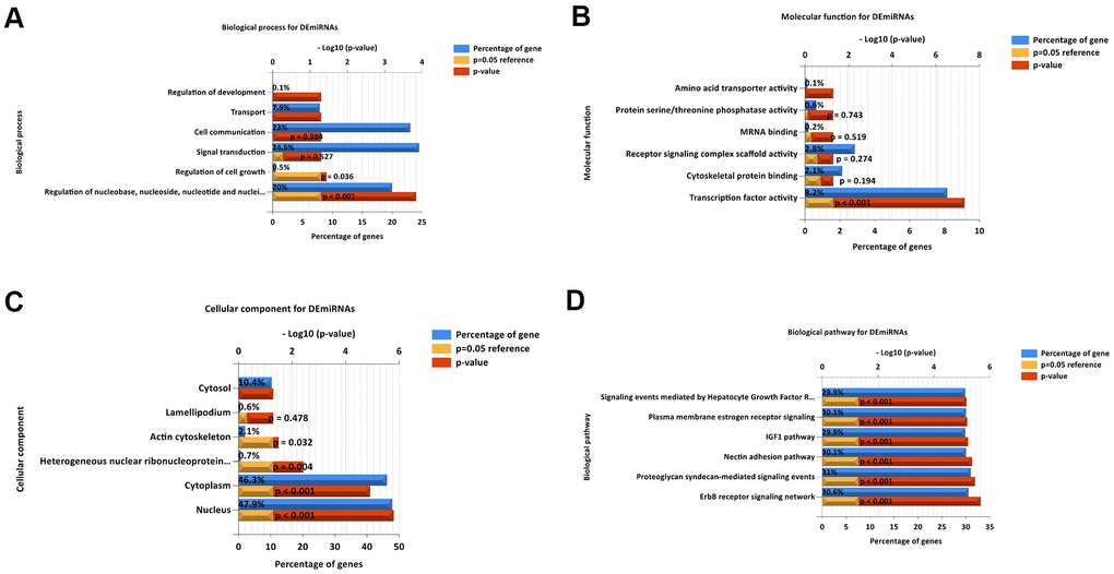 To understand thoroughly and fully the biological characteristics of the 55 DEMs in LUAD, we also fulfilled Gene Ontology (GO) annotation and biological pathway analysis. Regarding BP, the DEMs were concentrated in nucleoside, nucleotide, and others in Figure 3A. Regarding MF, the DEMs were significantly enriched in transcription factor activity in Figure 3B. Moreover, regarding CC were nucleus, cytoplasm, heterogeneous nuclear ribonucleoprotein, and actin cytoskeleton in Figure 3C. The most enriched biological pathway terms for the DEMs were related to the ERBB receptor signaling network, nectin adhesion pathway, proteoglycan syndecan-mediated signaling events and others in Figure 3D.