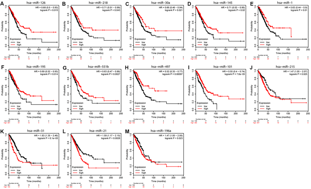 Dysregulated miRNAs have shown promise as noninvasive diagnostic and prognostic biomarkers for LUAD. Numerous studies indicated that altered expression of miRNAs is related to various cancers, including lung cancer [16]. In our study, high expression of four DEMs (has-miR-31, has-miR-21, has-miR-196a, and has-miR-215) and low expression of nine DEMs (hsa-miR-126, hsa-miR-218, hsa-miR-30a, hsa-miR-145, hsa-miR-1, hsa-miR-195, hsa-miR-551b, hsa-miR-497, and hsa-miR-101) were associated with worse OS in LUAD. Liu et al found that miR-126-3p was crucial in the invasion of NSCLC by targeting CCR1 [17]. Shi et al determined that downregulation of miR-218 was noted to serve an essential role in epithelial-mesenchymal transition (EMT) and cancer metastasis of lung cancer by targeting Slug/ZEB2 signaling [18]. MiR-30a played a crucial role in the occurrence of NSCLC [19]. Liu et al reported that miR-145 was downregulated in tumor tissues and that miR-145 overexpression resulted in downregulation of N-cadherin, vimentin, and E-cadherin, suggesting decreased EMT activity [20]. Korde et al found that levels of miR-1 were lower in NSCLC than normal tissue and that overexpression of miR-1 reduced tumor growth and angiogenesis [21]. Liang et al found that downregulating miR-195 simultaneously stimulated cell proliferation and inhibited cell apoptosis in LUAD [22]. Lin et al identified miR-551b as a cancer-specific miRNA that may predict the progression and prognosis of LUAD [23]. Cui et al indicated that inhibition of miR-101 promotes progression of NSCLC through activation of the Wnt/β-catenin signaling pathway [24]. Yin et al reported that miR-145 and miR-497 were downregulated in lung cancer cell lines and that miR-145 and miR-497 overexpression repressed TGF-β-induced EMT and the migration and invasion of cancer cell [25]. Recent researches have showed that miR-31 modulates the NSCLC cell cycle by targeting hMLH1 [26]. Bao et al revealed that serum miR-196a-5p may be a valuable noninvasive biomarker for the clinical diagnosis of NSCLC [27]. In our study, all miRNAs which associated with prognosis have been reported previously in lung cancer except miR-215. And maybe they could be the useful biomarker predictive of prognosis in LUAD.