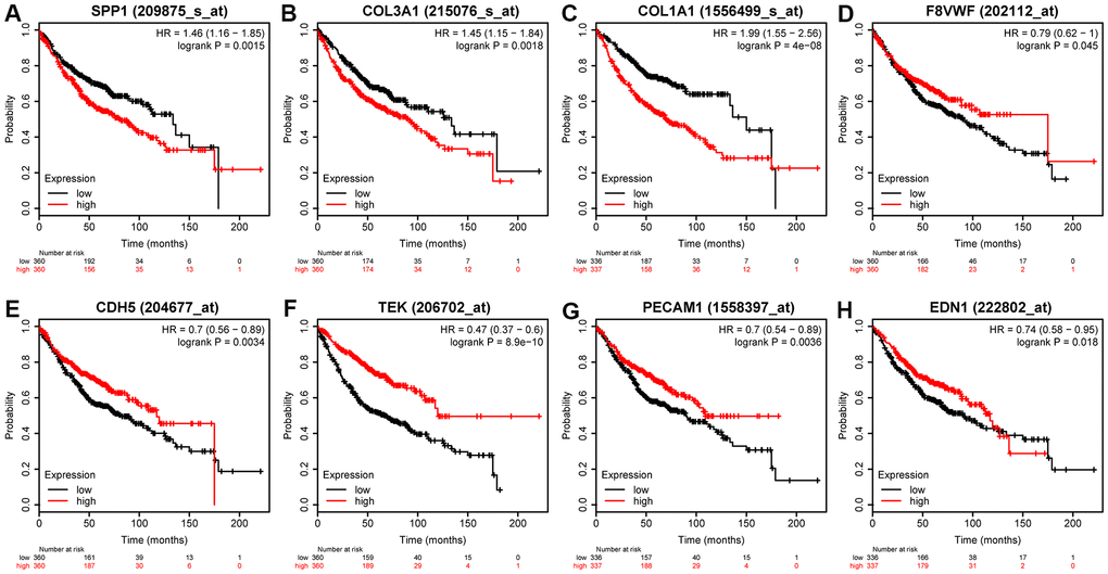 We used Kaplan-Meier (KM) plotter to evaluate the 55 DEMs and 8 hub genes. Among the DEMs, our results showed that low expression level of hsa-miR-126, hsa-miR-218, hsa-miR-30a, hsa-miR-145, hsa-miR-1, hsa-miR-195, hsa-miR-551b, hsa-miR-497, and hsa-miR-101 (P < 0.05) was associated with poor OS in LUAD (Figure 5A–5I). In contrast, high expression level of hsa-miR-215, hsa-miR-31, hsa-miR-196a, and hsa-miR-21 (P < 0.05) was also associated with poor OS in LUAD (Figure 5J–5M). Regarding the hub genes, high expression level of SPP1, COL1A1, and COL3A1 and low expression level of VWF, PECAM1, EDN1, CDH5, and TEK were associated with the poor OS in LUAD (P < 0.05) in Figure 6.