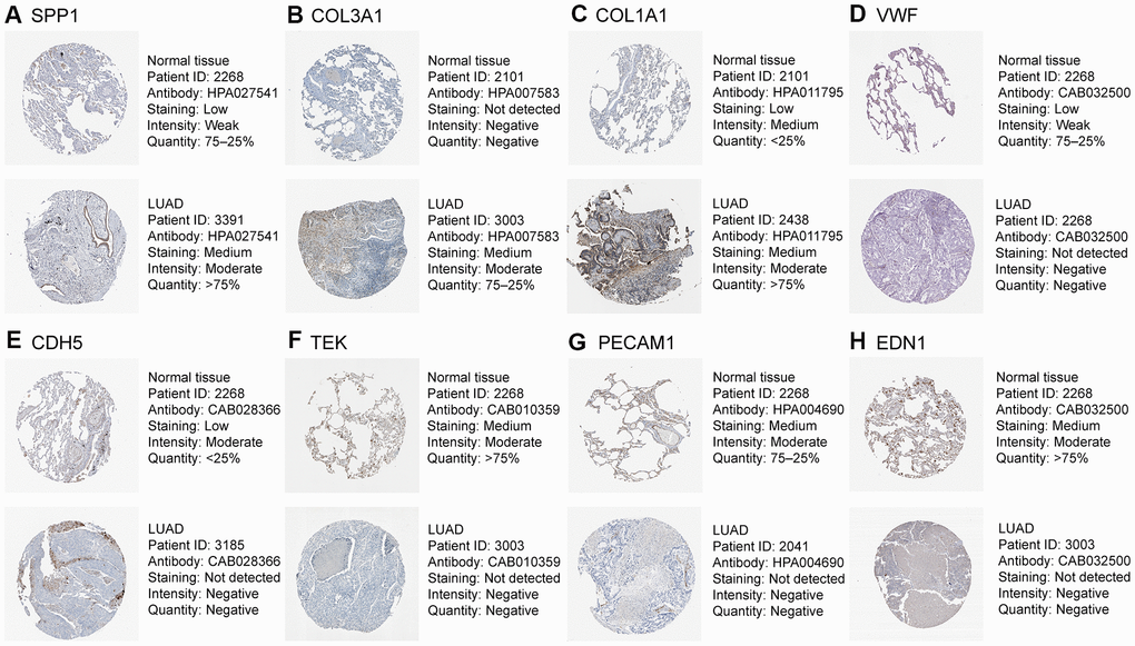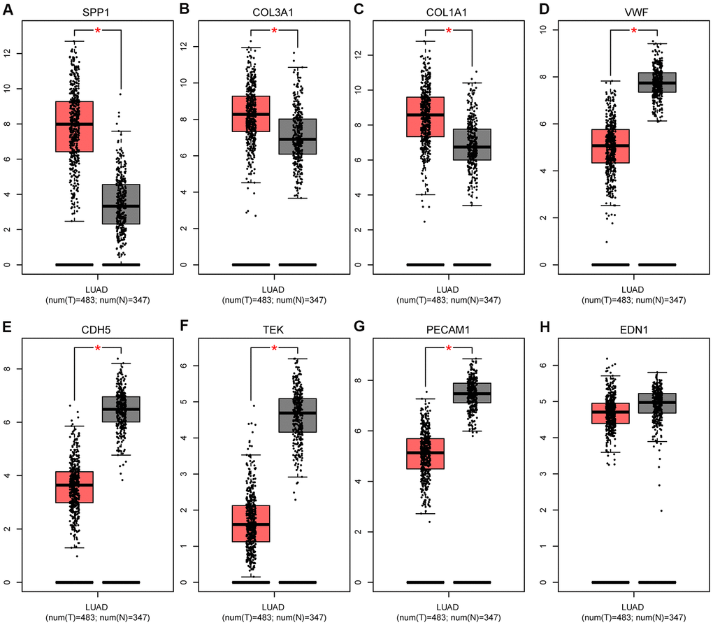 PECAM1 can code for CD31, belonging to the immunoglobulin superfamily of adhesion molecule, which can maintain and restore vascular integrity by the wingless-related integration site signaling pathway [28]. Yu et al analyzed the related microarray datasets (GSE9804) and identified that PECAM1 played a crucial role in the tumorigenesis of LUAD via regulation of vascular endothelial growth factor (VEGF) expression [29]. The mRNA transcription and the protein expression levels, we found that PECAM1 expression was significant down-regulated in LUAD tumor tissues. Importantly, we found that low expression of PECAM1 was a significant independent predictor of poor OS by univariate and multivariate survival analyses in LUAD. SPP1 has also been demonstrated in mice and humans to affect tumor cell migration, adhesion, and invasion, indicating its possible use as a diagnostic biomarker and potential therapeutic target in cancer [30]. Our enrichment analysis indicated that SPP1 is enriched in cell adhesion, the PI3K-Akt signaling pathway, and ECM-receptor interactions, which play an important role in LUAD. In addition, we confirmed that COL1A1 expression was higher in LUAD tissues. COL1A1 was reported to be enriched in various biological processes such as cell proliferation, metastasis, invasion, and angiogenesis [31]. Wei et al analyzed the GSE75037 microarray dataset and determined that COL1A1, CTGF, COL1A2, COL3A1, and BGN were involved in cell adhesion, the PI3K-Akt signaling pathway, and ECM-receptor interaction [32]. Above study was consistent with our findings. Besides its essential role in hemostasis, there is growing evidence that VWF has antitumor effects, mainly related to angiogenesis and apoptosis [33]. EDN1 were implicated in cancer progression, apoptosis, EMT, stromal reaction, and tumor invasion, spread, and drug resistance [34]. CDH5 is an adhesion molecule and member of the selectin family that contributes significantly to tumorigenesis and tumor progression [35]. TEK is a receptor tyrosine kinase that is expressed in endothelial cells. Dysregulated TEK expression has also been observed in several cancer, indicating that TEK expression may have prognostic value in these cancers [36].