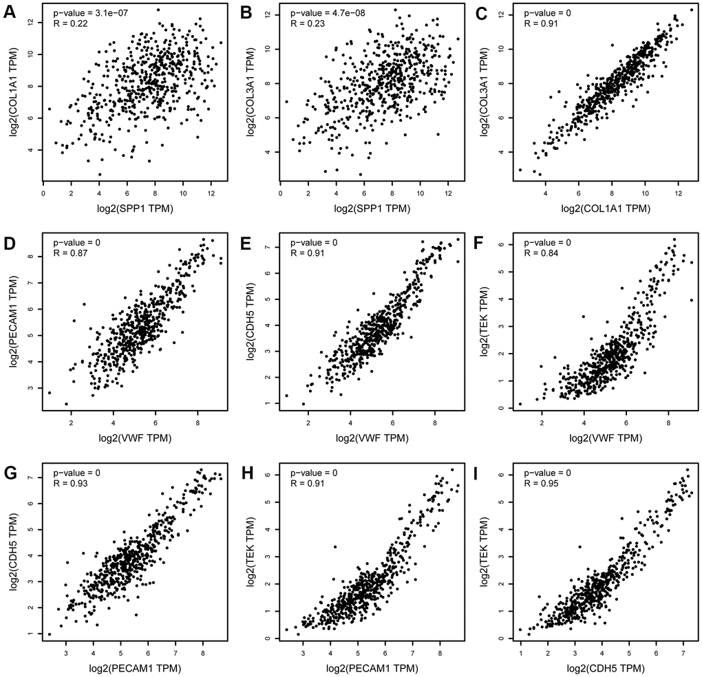 As shown in Figure 7, based on the Gene Expression Profiling Interactive Analysis (GEPIA) website, mRNA levels were upregulated for three genes and notably downregulated for five genes in LUAD. Moreover, using the Human Protein Atlas (HPA) website, we examined the protein expression level of the hub genes and observed that protein expression of SPP1, COL1A1, and COL3A1 was noticeably upregulated in tumor samples, whereas the protein expression of VWF, PECAM1, EDN1, CDH5, and TEK was noticeably downregulated (Figure 8). In the upregulated hub genes, increased expression of SPP1, COL1A1, and COL3A1 was strongly associated each other in LUAD. In the downregulated hub genes, increased expression in PECAM1, VWF, CDH5, and TEK was strongly associated each other in LUAD (Figure 9).