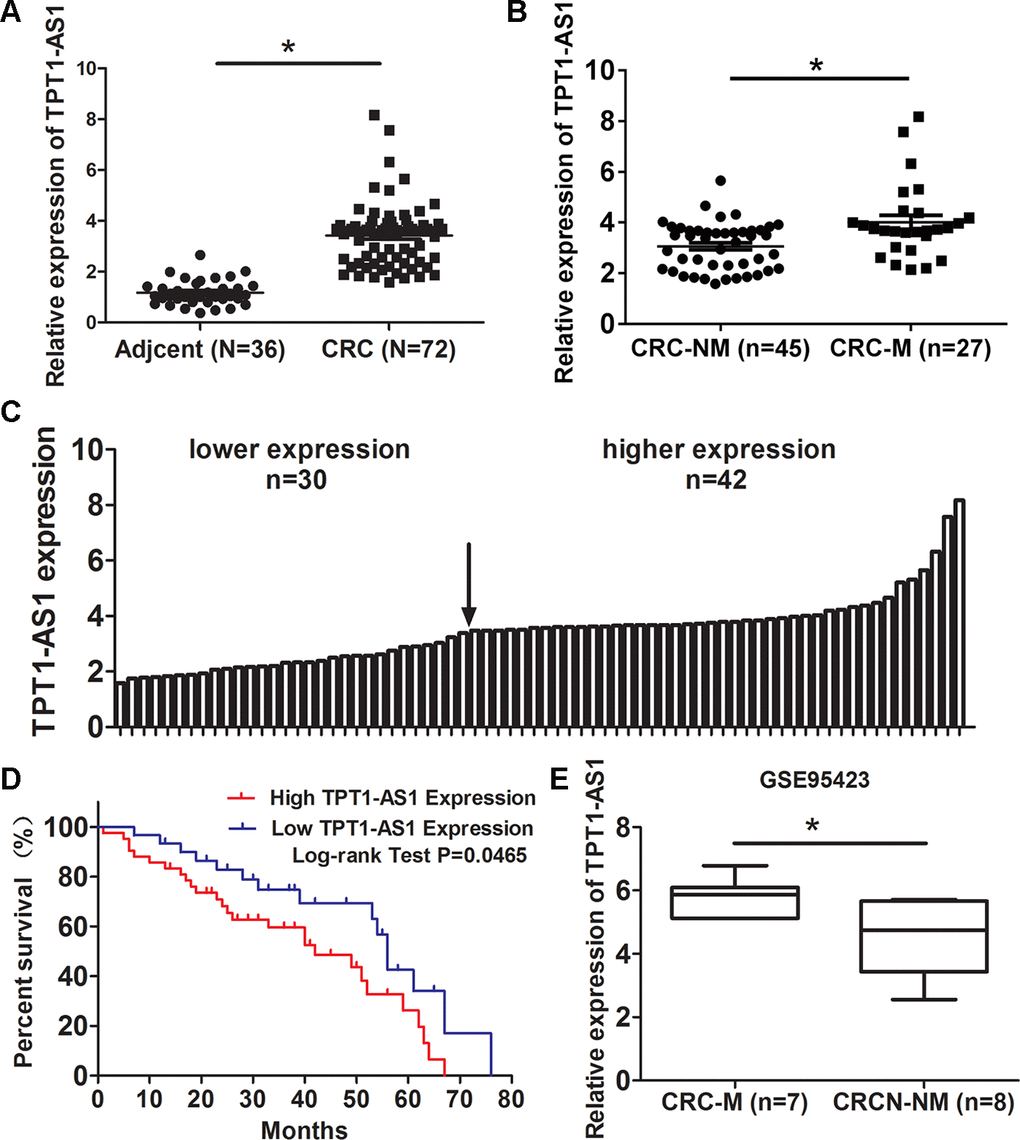 Firstly, we examined TPT1-AS1 expression in 72 CRC and 36 adjacent normal tissues by qRT-PCR method. The result showed that TPT1-AS1 was upregulated in CRC tissues (Figure 1A). Moreover, The level of TPT1-AS1 in metastasis CRC tissues was significantly higher than nonmetastatic tumor tissues (Figure 1B). Base on the median value of TPT1-AS1 expression in tumor tissues, the CRC patients were assigned high expression group (n=42) and low expression group (n=30) (Figure 1C). The correlation of TPT1-AS1 expression and CRC clinical pathologic features were investigated by χ2 tests. As shown in Table 1, TPT1-AS1 expression was significantly correlated with tumor invasion depth (P=0.038), TNM stage (P=0.025) and distant metastasis (P=0.031). Additionally, the high TPT1-AS1 expression in CRC patients was implied the poor overall survival (Figure 1D). Besides, our result was consistent with the GEO data (GSE95423) which demonstrated TPT1-AS1 upregulation in CRC tissue with liver mmetastasis comparing to CRC tissue without metastasis (Figure 1E).
