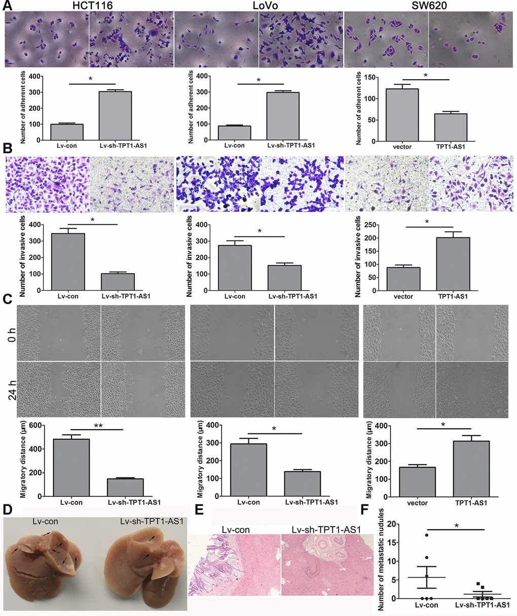 As shown in Figure 3A, TPT1-AS1 knockdown significantly enhanced the cell adhesion ability, whereas TPT1-AS1 overexpression had the opposite effect. The migration and invasion assays demonstrated that TPT1-AS1 depletion significantly impaired cell migration and invasion, but the opposite was observed when TPT1-AS1 was overexpressed in the SW620 cells (Figure 3B, 3C). Furthermore, we investigated the effect of TPT1-AS1 on liver metastasis in vivo. As shown in Figure 3D–3F, the TPT1-AS1 knockdown group displayed a reduction in the number of metastatic modules in the liver when compared to the control group, indicating that TPT1-AS1 could promote cell migration and metastasis in vitro and in vivo.
