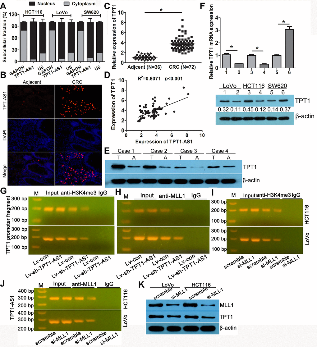 To further investigate the potential mechanism of TPT1-AS1 in upregulating the expression of TPT1 in CRC, we analysed the extent of histone modification in the ENCODE data. The activated histone modification H3K4 m3 was enriched around the TPT1 promoter region (Supplementary Figure 2). Whether TPT1-AS1 could recruit methyltransferase MLL1, the charge of H3K4 trimethylation modification. RNA-Protein Interaction Prediction analysis displayed an interaction between TPT1-AS1 and MLL1 (Supplementary Figure 3). The ChIP assay was applied to verify the interacting by using the anti-H3K4 me3 and MLL1 antibodies. As shown in Figure 4G, the amplification of the TPT1 promoter fragment (TPT1-pro) was reduced in the precipitates of the TPT1-AS1-silenced cells, implying that TPT1-AS1 mediated the H3K4 me3 modification in the TPT1 transcription region. The ChIP assay using the MLL1 antibody displayed a similar reduction in TPT1-pro (Figure 4H), indicating that MLL1 participated in TPT1-AS1 regulation TPT1 transcription. In addition, it demonstrated that the level of H3K4 me3 was reduced in the TPT1 promoter region after MLL1 depletion (Figure 4I). The RIP assays confirmed that TPT1-AS1 could physically bind to MLL1 (Figure 4J). TPT1 expression was impeded following the knockdown of MLL1 by siRNA (Figure 4K). Taken together, these results indicated that TPT1-AS1 recruited MLL1 to the promoter region of TPT1 and enhanced the H3K4 me3 level, resulting in the upregulation of TPT1.