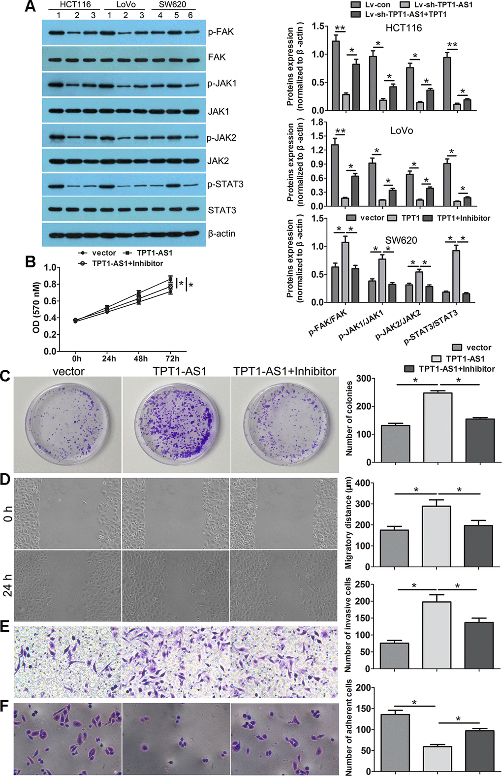 The present study demonstrated that TPT1-AS1 promotes the progression and metastasis of CRC by upregulating the TPT1 expression and activating the FAK and JAK-STAT3 signalling pathways. Thus, TPT1-AS1 might be used as a potential therapeutic target for CRC.