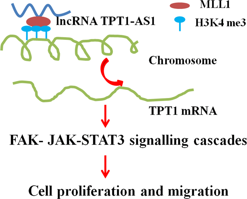 Emerging studies have confirmed that numerous dysregulated lncRNAs are involved in the development and progression of CRC [15–17]. Therefore, exploring the function and molecular mechanisms of lncRNAs may aid in the identification of novel and valuable targets for the treatment of CRC. In this study, we demonstrated that the lncRNA TPT1-AS1 was upregulated in the CRC tissues and cell lines. The high expression of TPT1-AS1 was associated with unfavourable CRC clinicopathological characteristics such as advanced stage, lymph node metastasis and poor prognosis. Furthermore, TPT1-AS1 knockdown significantly inhibited cell proliferation, migration and invasion and enhanced cell adhesion. Moreover, TPT1-AS1 could upregulate TPT1 expression by recruiting MLL1 to the promoter region of TPT1 and enhances the H3K4 me3 level. The oncogenic effect of TPT1-AS1 on CRC cells and tissues was dependent on TPT1. In addition, TPT1-AS1 was found to promote the development and progression of CRC via the FAK and JAK-STAT3 signalling cascades.