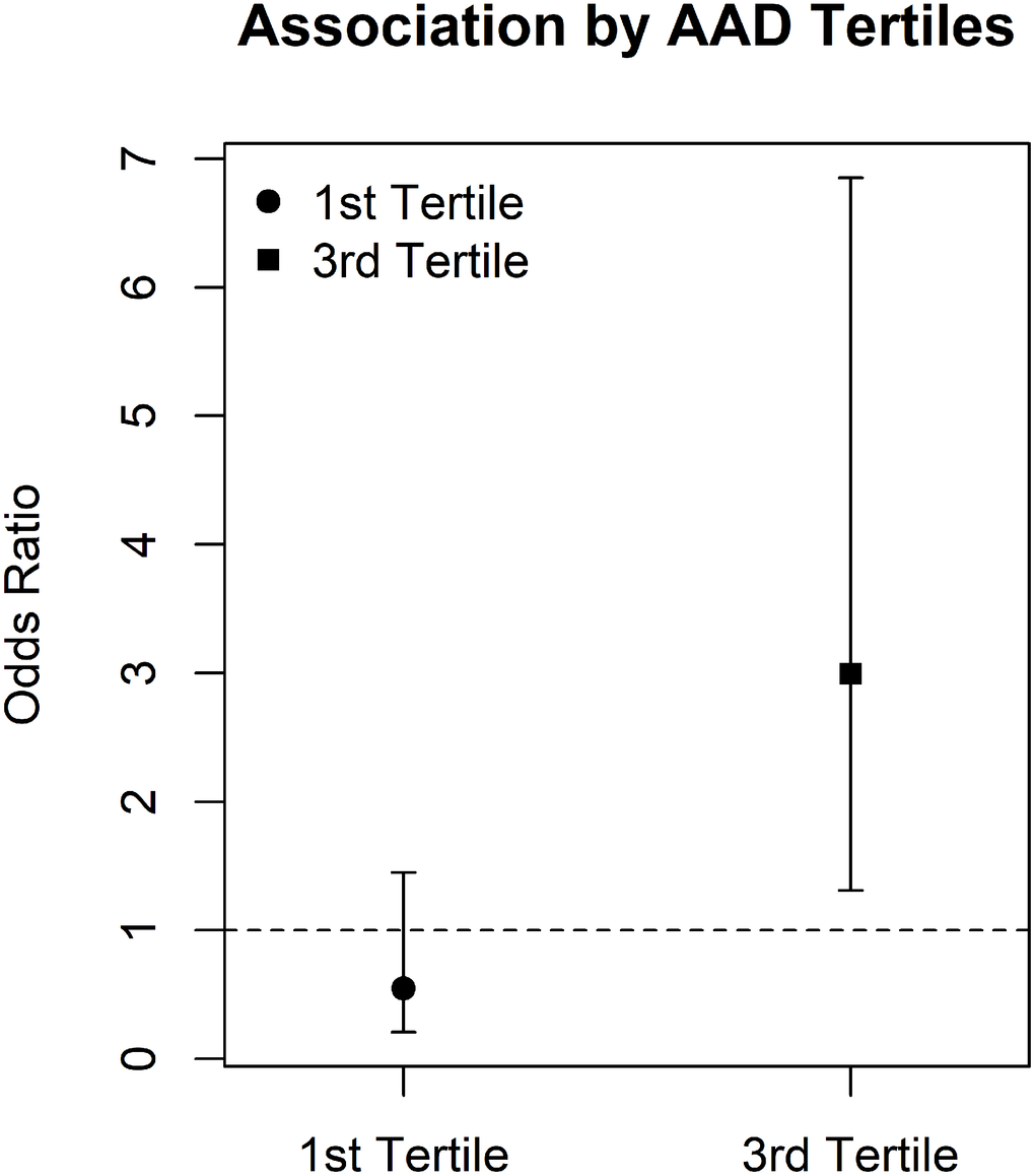 As interaction effect estimates can be difficult to visualize, we also examined interactions by classifying individuals based on tertiles of the distribution for each of the accelerated aging parameters and then compared the first (lowest age acceleration) versus third (highest age acceleration) tertiles. We focused these analyses on the AAD-proximity to roadways interaction for PAD as it was the only outcome and interaction that showed an interaction proximity to roadways as well as traffic-related air pollution sources. Associations between PAD and proximity to roadways was effectively null in individuals in the lowest tertile of the AAD distribution (interaction odds ratio = 0.81, 95% confidence interval = 0.34 – 1.90; mean AAD = -2.52 y) while we saw an elevated association in the highest tertile of the AAD distribution (interaction odds ratio = 2.79; 95% confidence interval = 1.09 – 7.11; mean AAD = 11.5 y; Figure 2). The interaction between AAD tertile and proximity to roadways was also significant for PAD (P = 0.03).