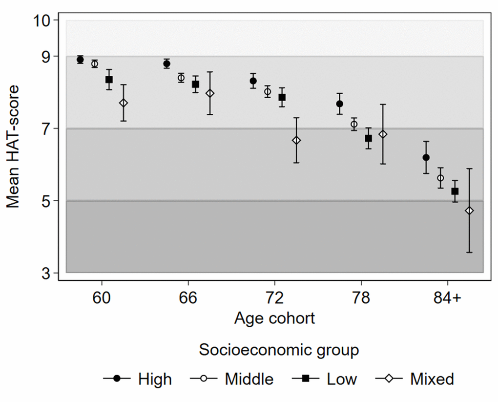 Baseline health by SES group and age is illustrated in Figure 1. The average health status of Mixed SES individuals at age 60 was comparable to the health of High SES individuals at the age of 78. Substantial cognitive and physical deficits indicated by HAT scores <7 were on average experienced by the Mixed SES group already at 72 years, the Low SES group at 78 years, and the High SES group at 84 years.