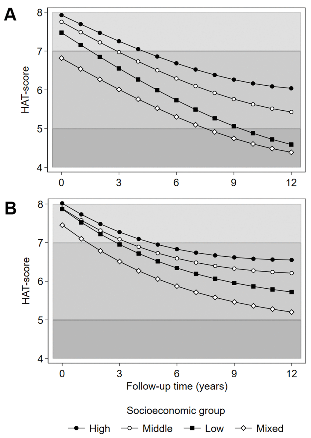 Associations between SES groups and HAT over 12 years are presented in Table 4, and the predicted trajectories of health decline for SES groups are illustrated in Figure 2. In the age- and sex-adjusted model Mixed SES had the poorest health at baseline, followed by Low SES, relative to the High SES group, (Table 4, Model 1; Figure 2A). Low SES had the fastest health decline, and over time, the health trajectories of the Low and Mixed SES groups converged (Figure 2A), while the High and Middle SES groups had slower health deterioration.