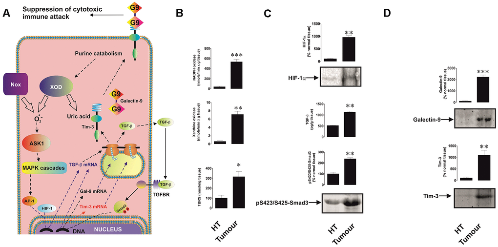 We found that all five tested breast cancer patients showed very high levels of xanthine oxidase and NADPH oxidase activities as well as thiobarbiturate-reactive species (TBRS, products of lipid peroxidation indicating increased oxidative burst) levels in tumour tissues compared to healthy tissues (Figure 1A, 1B). Respectively, levels of HIF-1α were also significantly higher in tumour samples (Figure 1C). This was in line with the highly increased amounts of tumour-associated TGF-β and intracellular levels of phospho-S423/S425-Smad3 (active form, Figure 1C). In line with our previous observations [1], levels of both Tim-3 and galectin-9 were substantially increased in tumour tissues compared to non-malignant samples (Figure 1D).