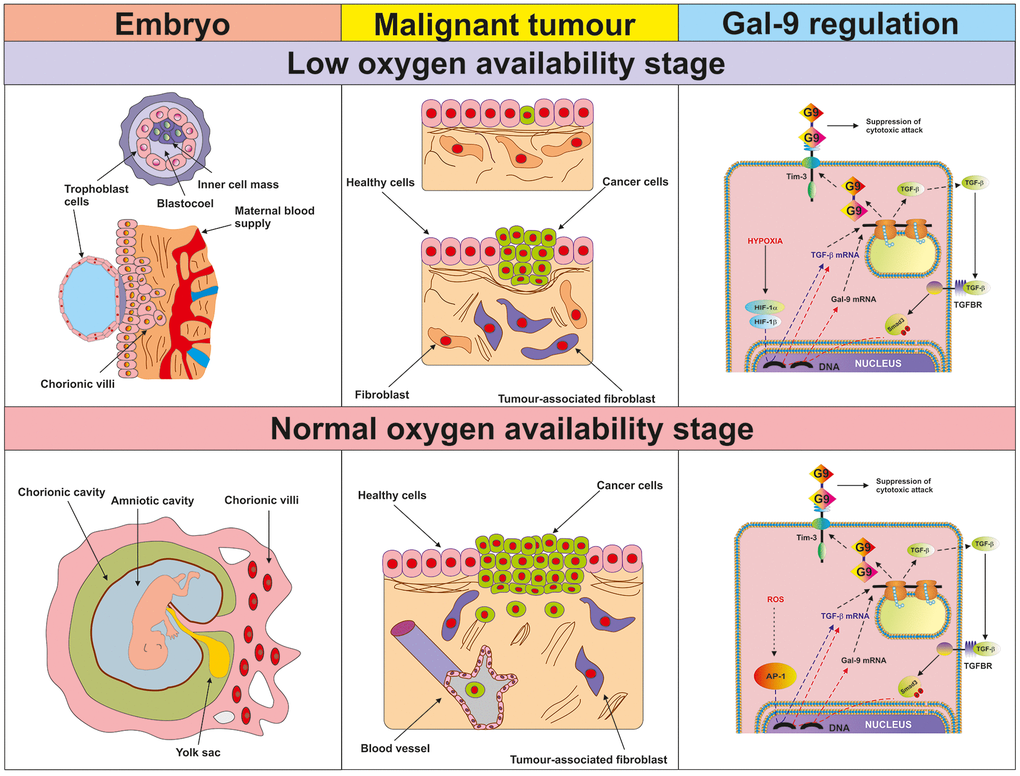 Here we report for the first time that in human breast cancer, AML and embryonic cells, HIF-1 and AP-1 upregulate the expression of TGF-β, leading to the activation of Smad3 through autocrine action. This process subsequently upregulates galectin-9 expression in both malignant and embryonic cells, but not in mature healthy human cells. Activated Smad3 therefore displays differential behaviour in cancer/embryonic vs healthy cells.
