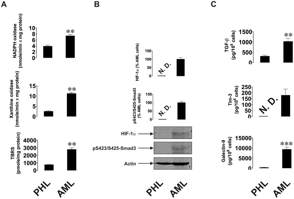 Similar observations were seen in AML, a non-solid malignancy. AML cells isolated from newly diagnosed patients were compared with primary leukocytes isolated from healthy donors upon culturing them for 24 h. AML cells showed significantly upregulated xanthine oxidase and NADPH oxidase activities as well as TBRS levels (Figure 2A), which suggests a higher level of oxidative stress in AML cells. HIF-1α and phospho-S423/S425-Smad3 were almost undetectable in primary healthy leukocytes, but were clearly detectable in AML cells (Figure 2B). AML cells released significantly higher amounts of TGF-β compared to healthy leukocytes. Respectively, AML cells secreted much higher amounts of both Tim-3 and galectin-9 (Figure 2C; secreted levels were measured since over 24 h AML cells release much higher amounts of these proteins compared to those present in the cells at a single moment of time, when the cells are harvested).